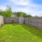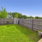 The property is set back from the road, benefiting from off-street parking spaces directly in front. To the rear, an enclosed private garden features a paved patio area ideal for outdoor dining and entertaining, leading onto a neat lawn area bordered by timber fencing, mature shrubs, and a practical garden shed providing additional storage. This outdoor space offers both privacy and security, ideal for families and those with pets.