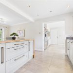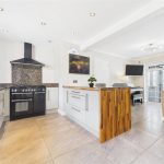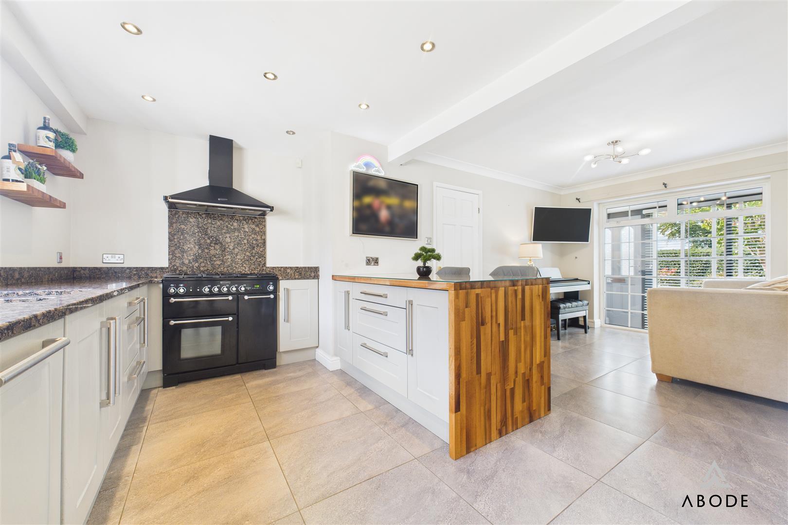 A well-appointed fitted kitchen with a wide range of matching wall and base units, wood block worktops with granite inset surfaces, and integrated appliances. Features a one-and-a-half sink with carved drainer and mixer tap, dishwasher, Range Master five-ring gas hob with oven, grill, and extractor hood. Additional highlights include a breakfast bar, underfloor heating spotlighting, TV aerial point, and dual aspect double glazed windows.