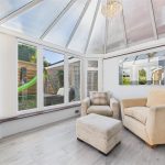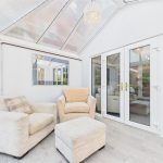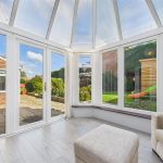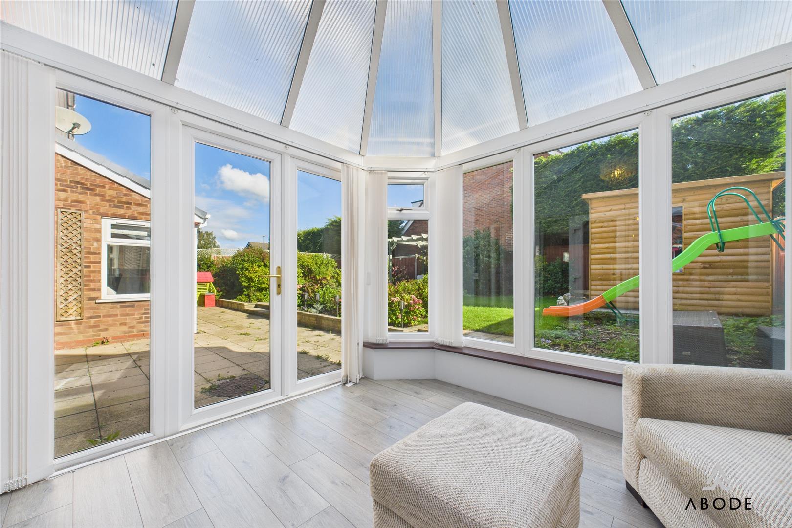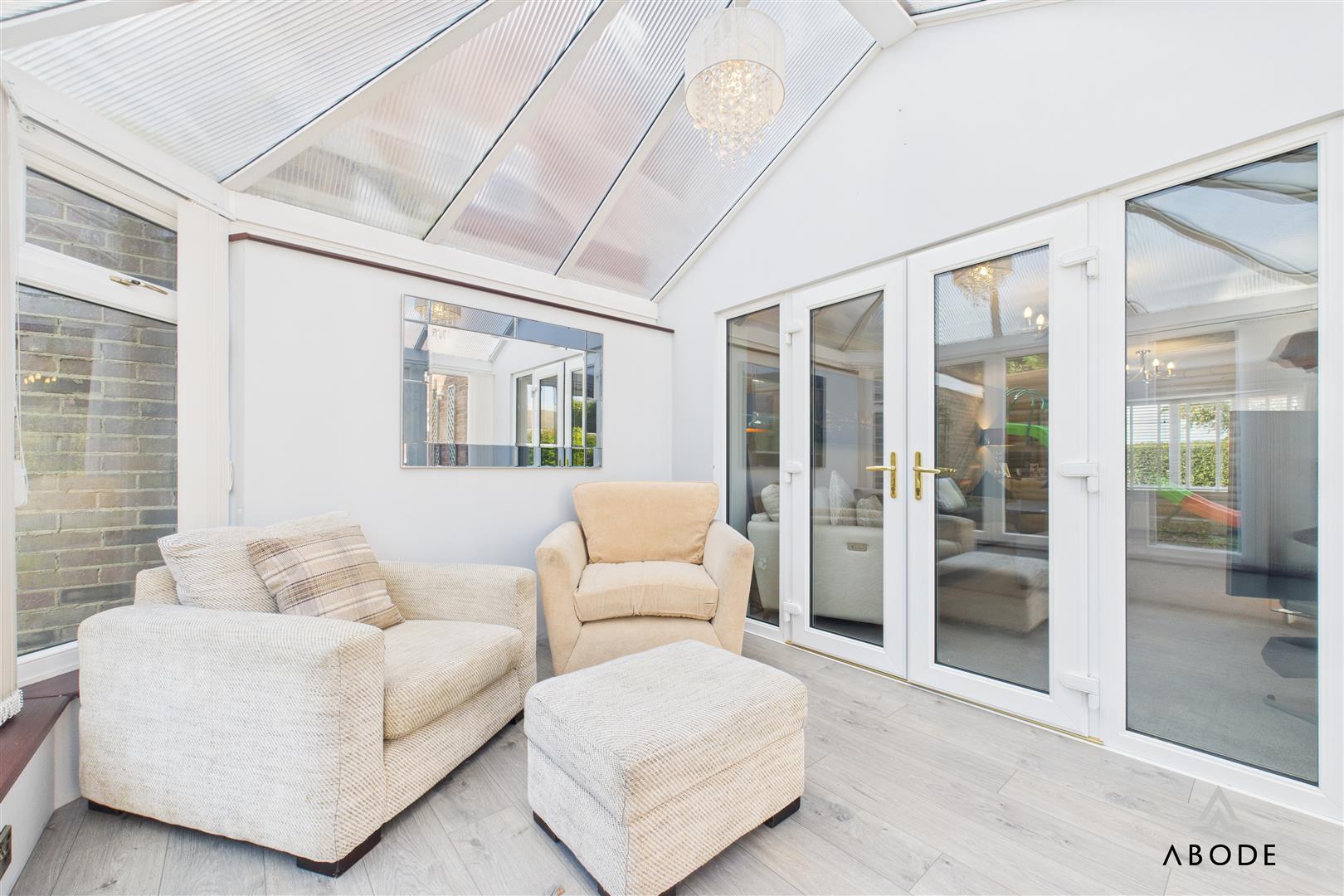 Light-filled conservatory with UPVC double glazed windows to the side and rear elevations, panelled flooring, Perspex roof, and double doors leading directly into the rear garden.