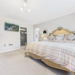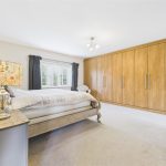 A spacious principal bedroom featuring a UPVC double-glazed window to the front elevation and central heating radiator. The suite includes an extensive range of fitted wardrobes with hanging rails and shelving. A generous walk-through storage/dressing area, with a rear-facing UPVC double-glazed window, provides an ideal dressing room space before entering the main bedroom.