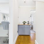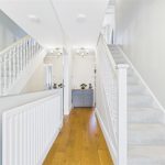Spacious hallway with central heating radiator, telephone point, thermostat, and useful under-stairs storage. Features a balustrade staircase rising to the first-floor landing, with internal doors leading to the main reception rooms.