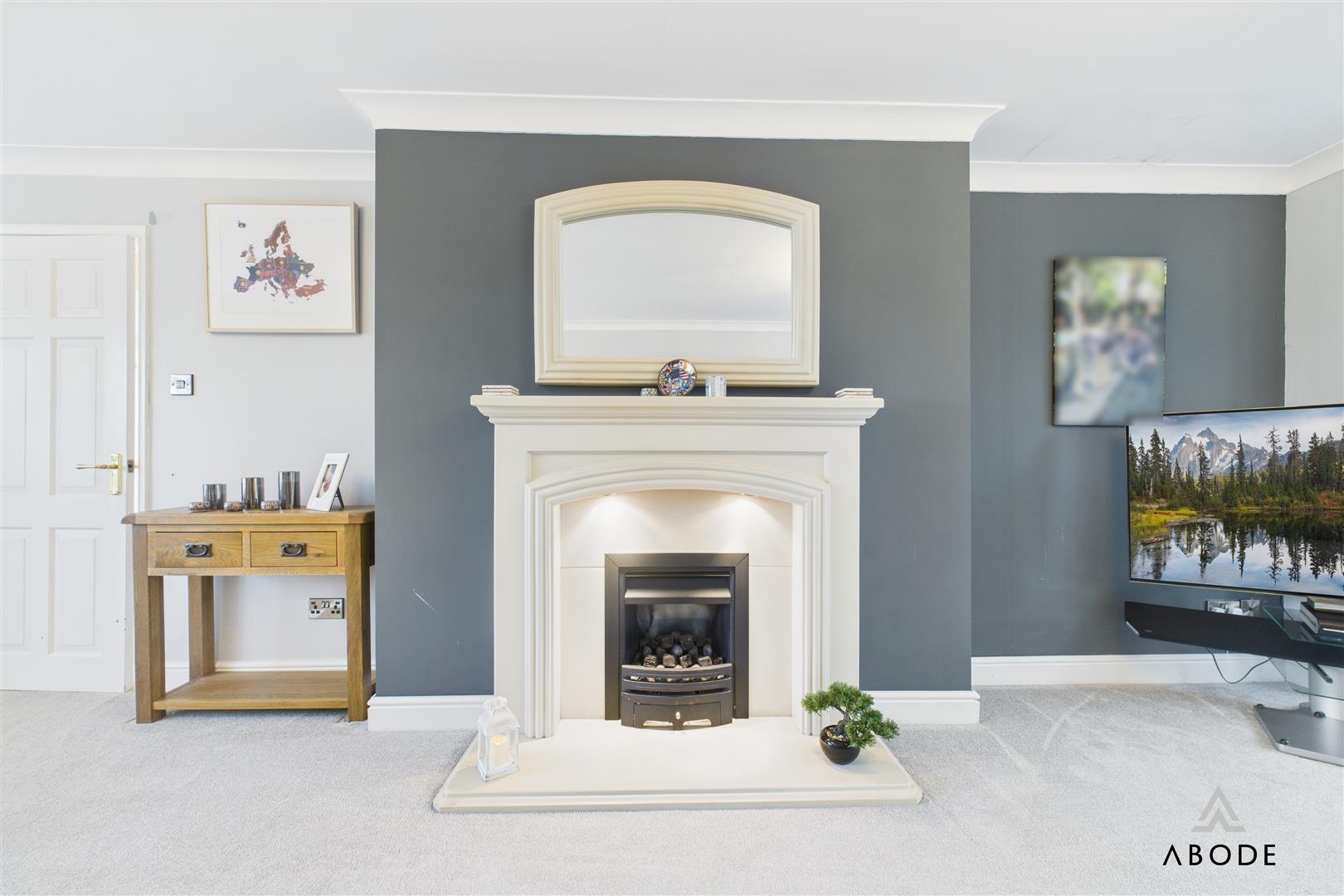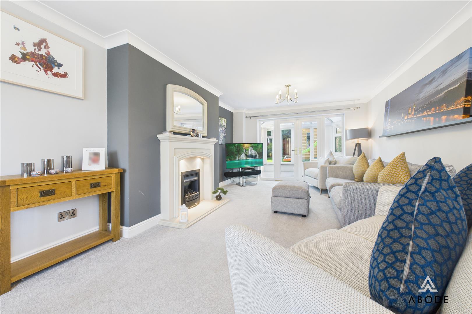 A bright and inviting lounge with a UPVC double glazed bay window to the front elevation. Includes two central heating radiators, a focal point gas fireplace with Adam-style surround, TV aerial point, and French doors with adjoining windows opening into the conservatory.