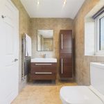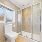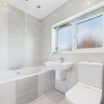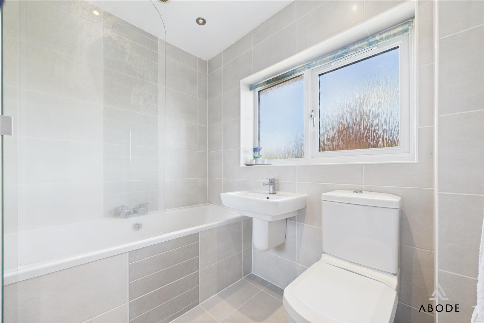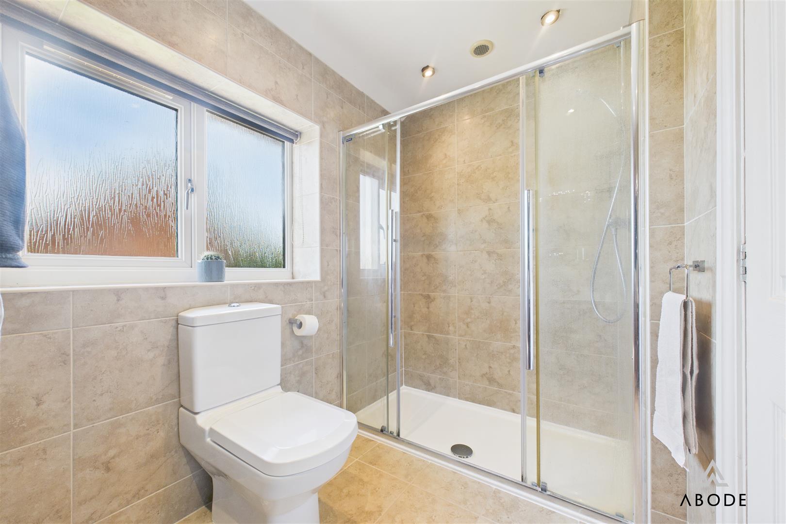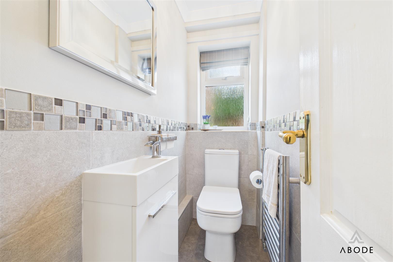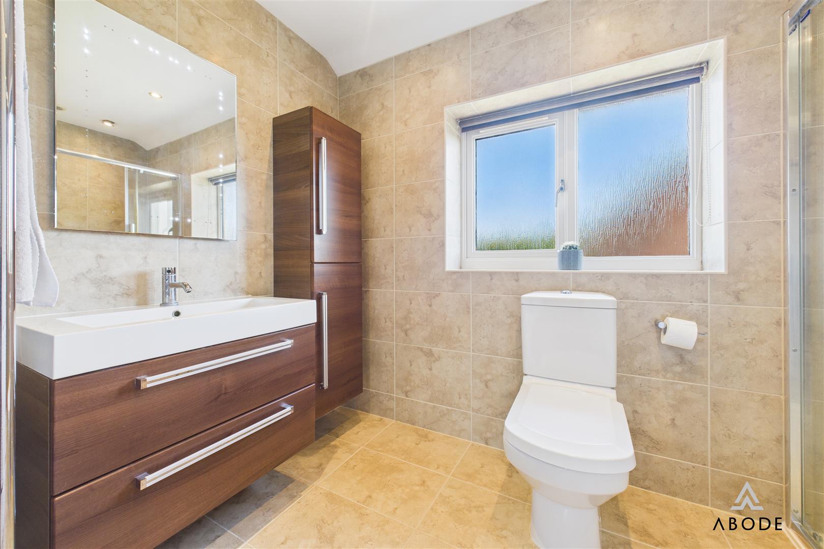 Fitted with a low-level WC and wash hand basin with mixer tap. Includes a chrome heated towel radiator and UPVC double glazed frosted window to the rear.