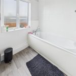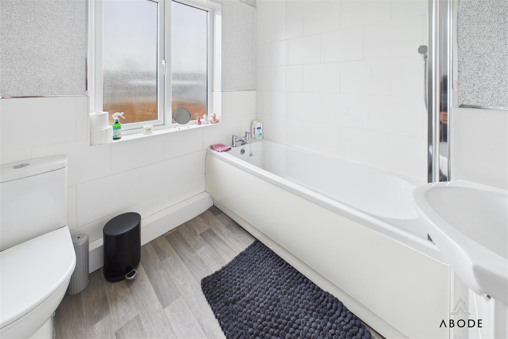 Bath with a shower over, low flush wc, wash hand basin, chrome ladder style radiator and upvc double glazed window.