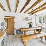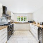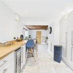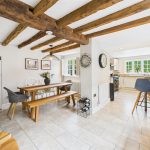 To the rear, the kitchen and dining space form the heart of the home. The dining area, with its exposed beams and tiled flooring, offers ample room for a family table and flows seamlessly into the bespoke fitted kitchen. The kitchen is equipped with a range-style cooker, integrated appliances, and extensive storage finished with complementary work surfaces. A breakfast bar provides informal seating, while dual aspect windows ensure this room remains bright and welcoming. A separate utility room provides additional space for appliances and practical storage.