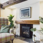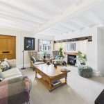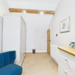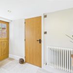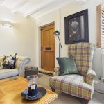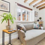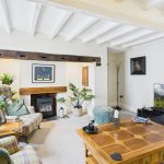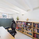 The property is entered via a solid timber front door into a welcoming hallway, where exposed beams and stone flooring immediately showcase the home’s character. The hallway gives access to the principal reception rooms, cloakroom, and stairs to the first floor. To the front, the living room is a delightful space with whitewashed beams, a feature fireplace with timber mantel, and a large window filling the room with natural light. Adjacent sits a versatile study or snug, currently used as a home office, with built-in storage and another attractive beamed ceiling.
