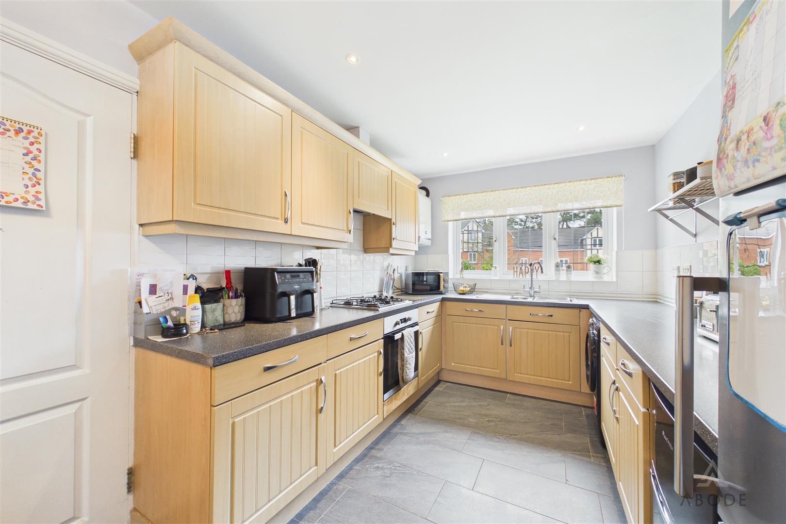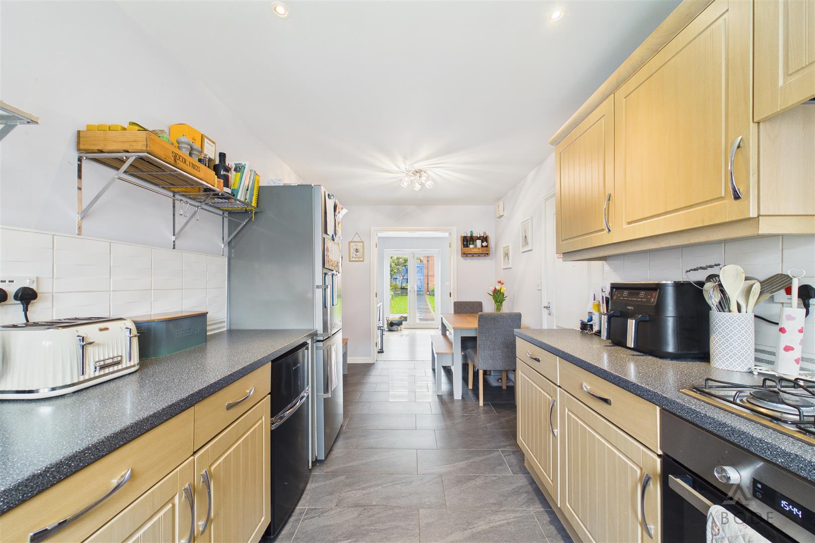 Base and eye level units with complimentary worktops, one and a half bowl stainless steel sink with draining board, integrated cooker and hob with extractor hood above. Space and plumbing for a washing machine and fridge freezer, UPVC double glazed window to the front elevation, central heating radiator, tiled flooring, ample space for a dining table and chairs.