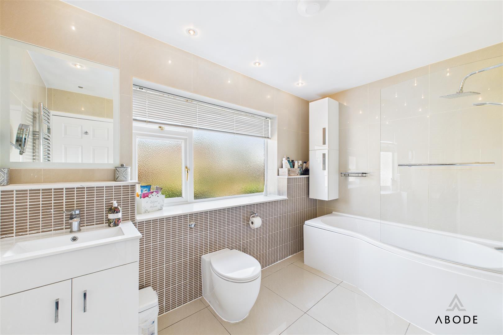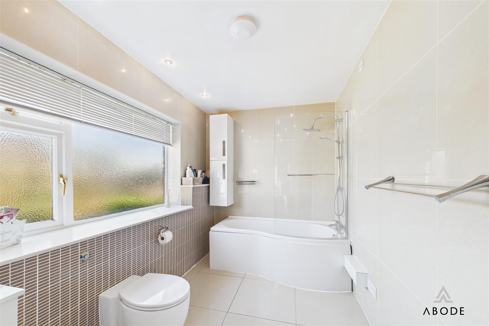 A second double bedroom at the front of the property benefits from its own en-suite shower room, featuring a WC, hand wash basin with storage below, shower enclosure, and imported wall tiles. Two further spacious double bedrooms share a centrally located family bathroom, which boasts a three-piece suite with a P-shaped shower bath, curved glass shower screen, WC, and vanity hand wash basin, complemented by stylish wall and floor tiling. The room also includes a heated towel rail and a window overlooking the rear garden.