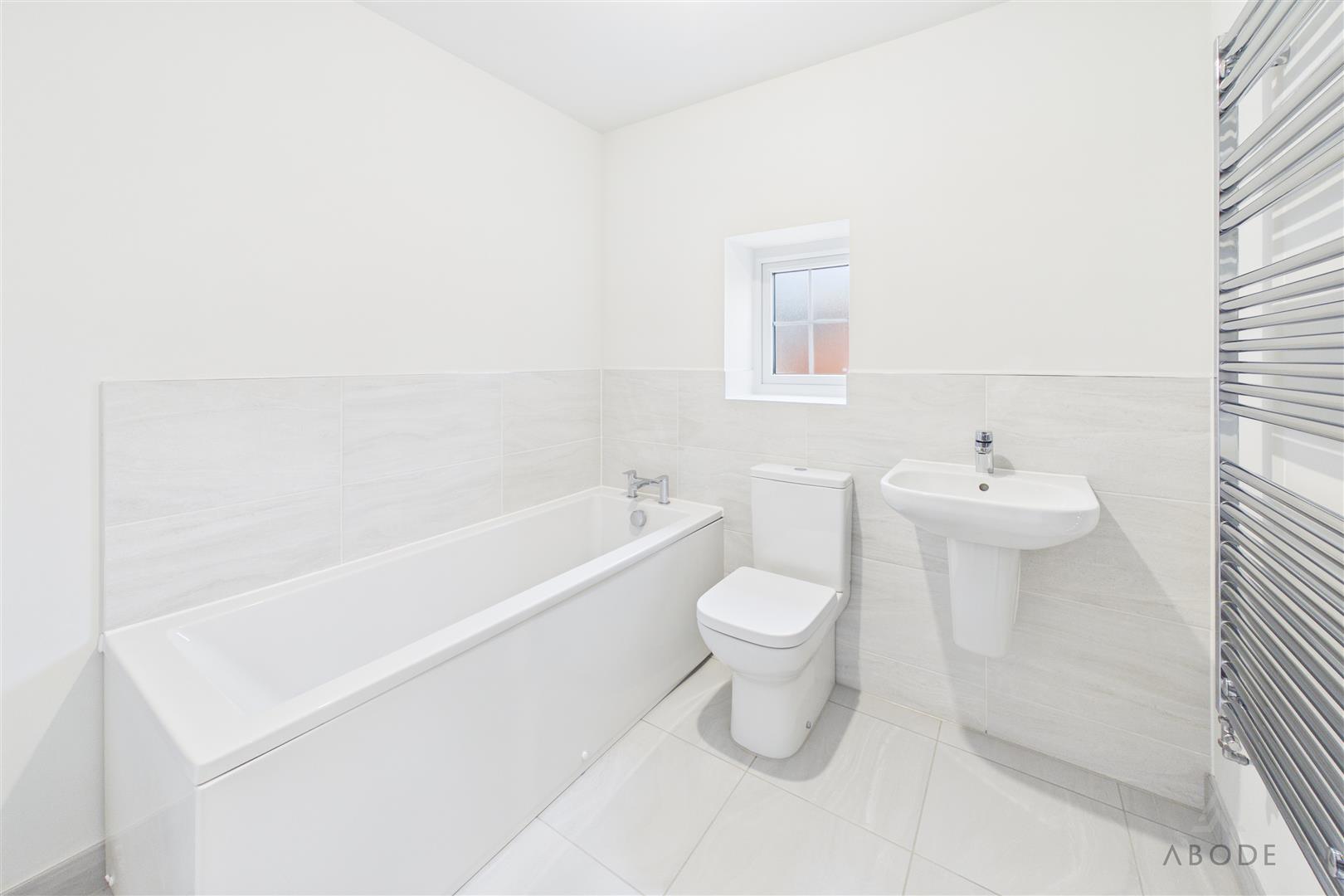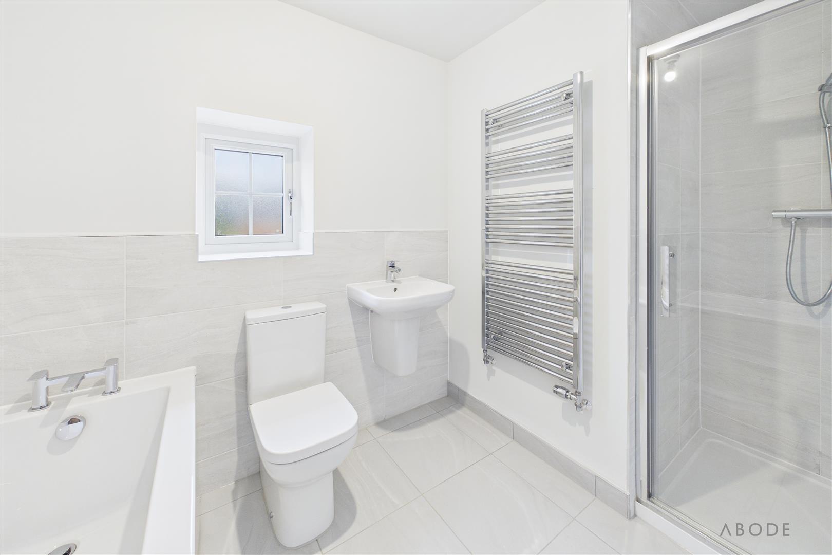 Panel enclosed bath and a separate shower, wash hand basin, low flush wc, chrome heated towel radiator and a upvc double glazed window.