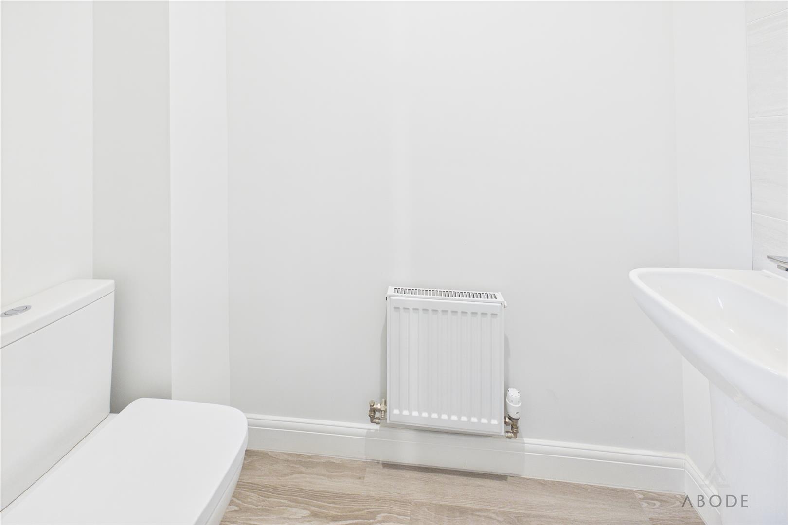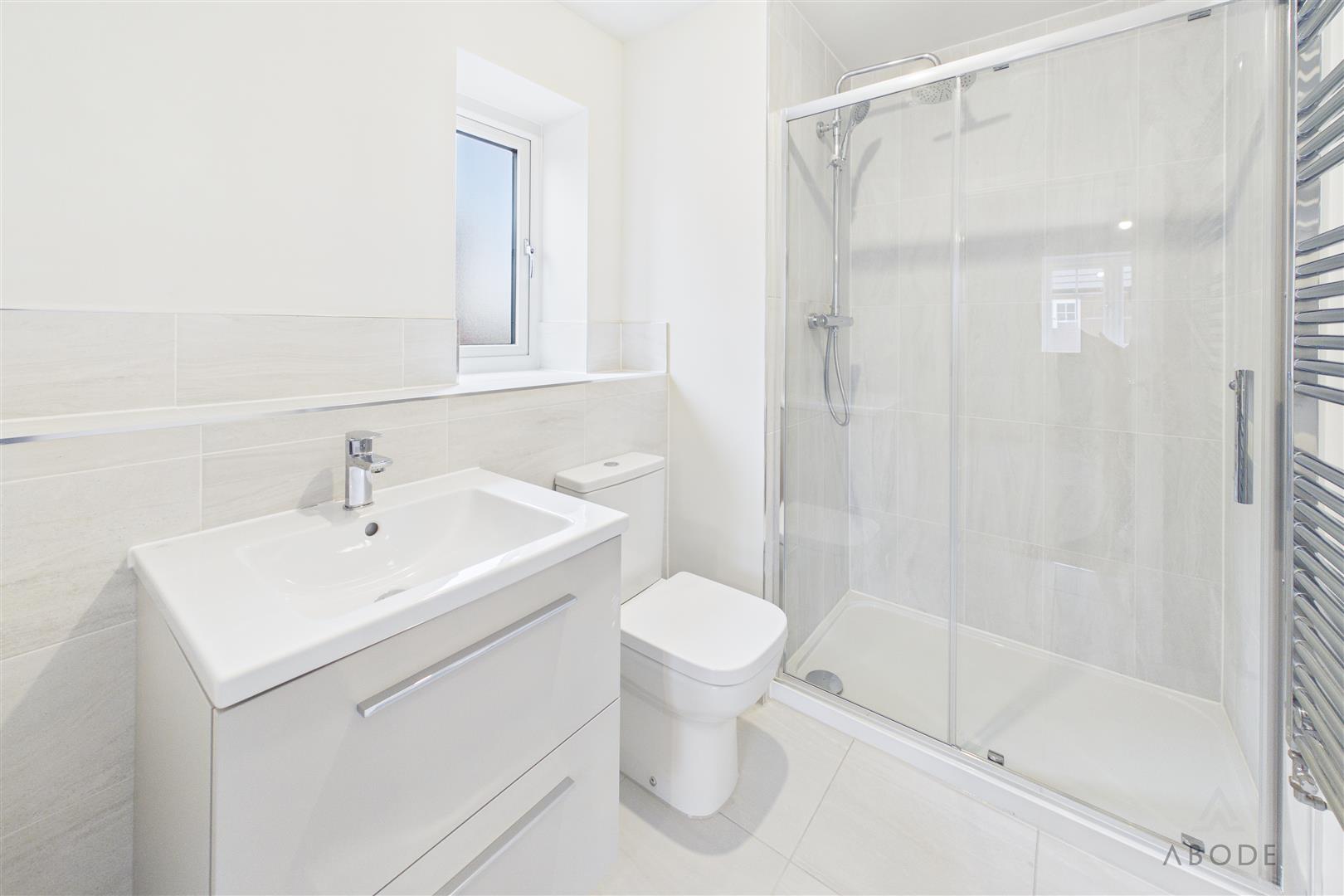 Shower, low flush wc, wash hand basin, chrome heated towel radiator and upvc double glazed window.
