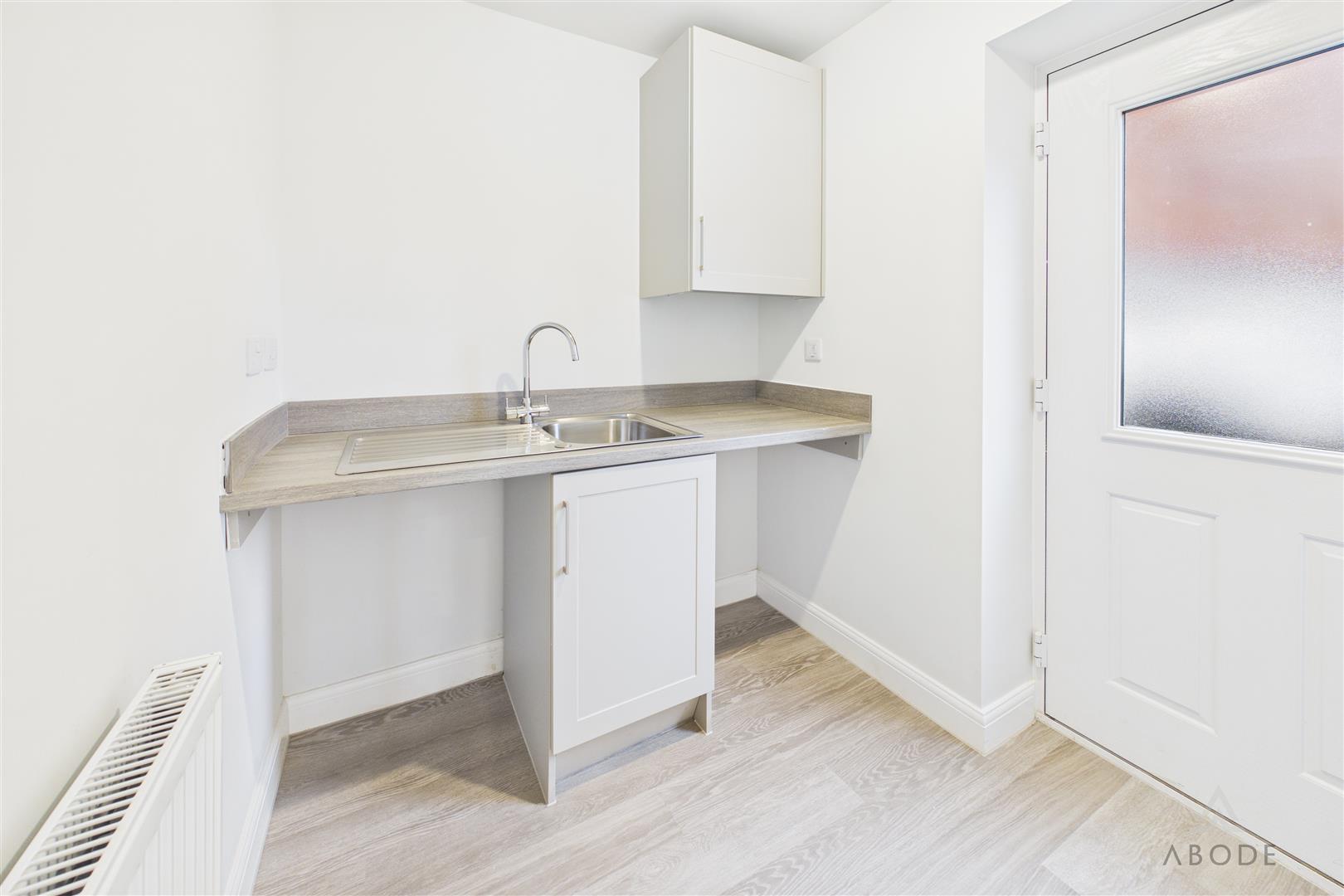 Fitted cupboard, and boiler cupboard, sink and drainer unit, work surfaces, plumbing and space for a washing machine and space for a tumble dryer, radiator and a door to the outside.