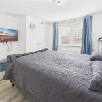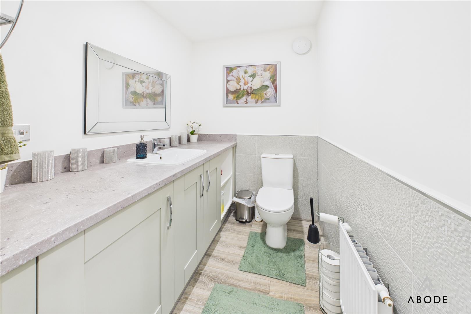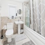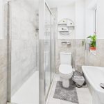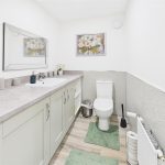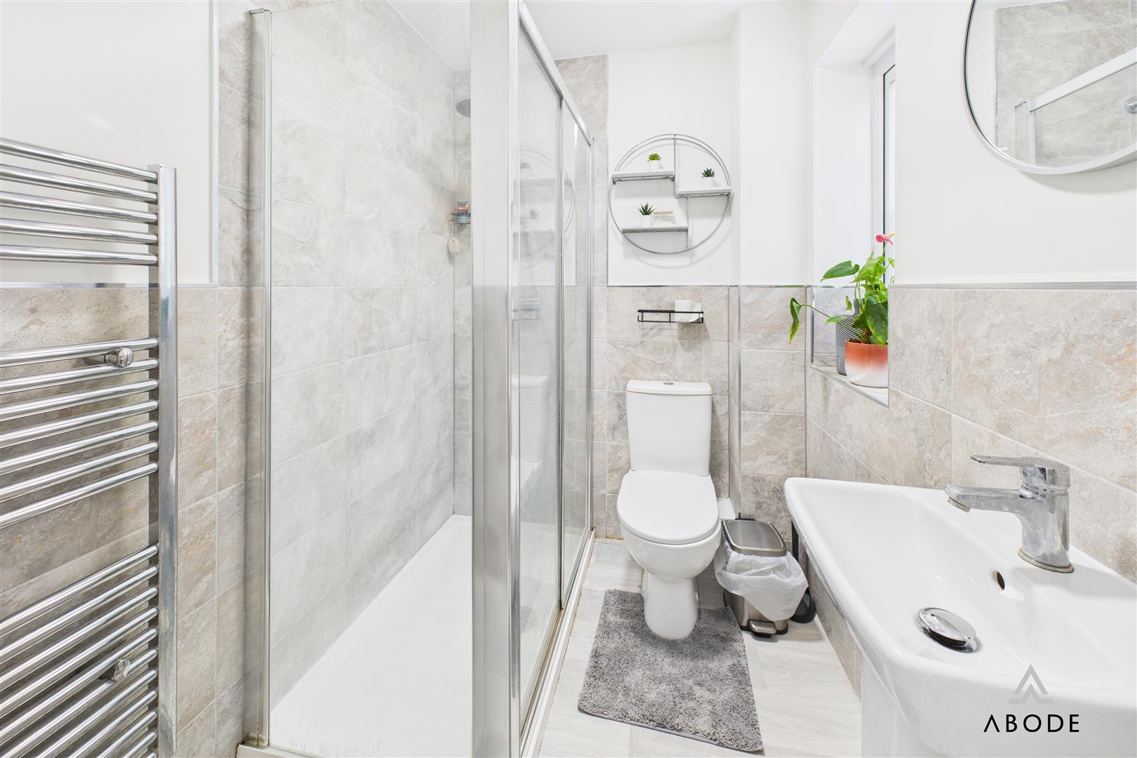 Corner shower cubicle, low flush wc, wash hand basin, chrome ladder style radiator and a upvc double glazed window.