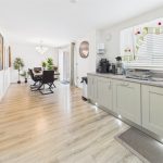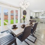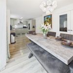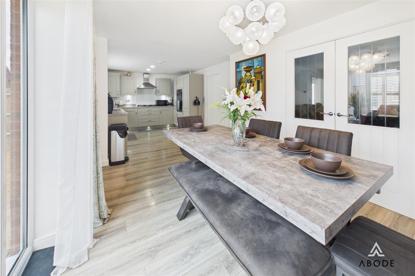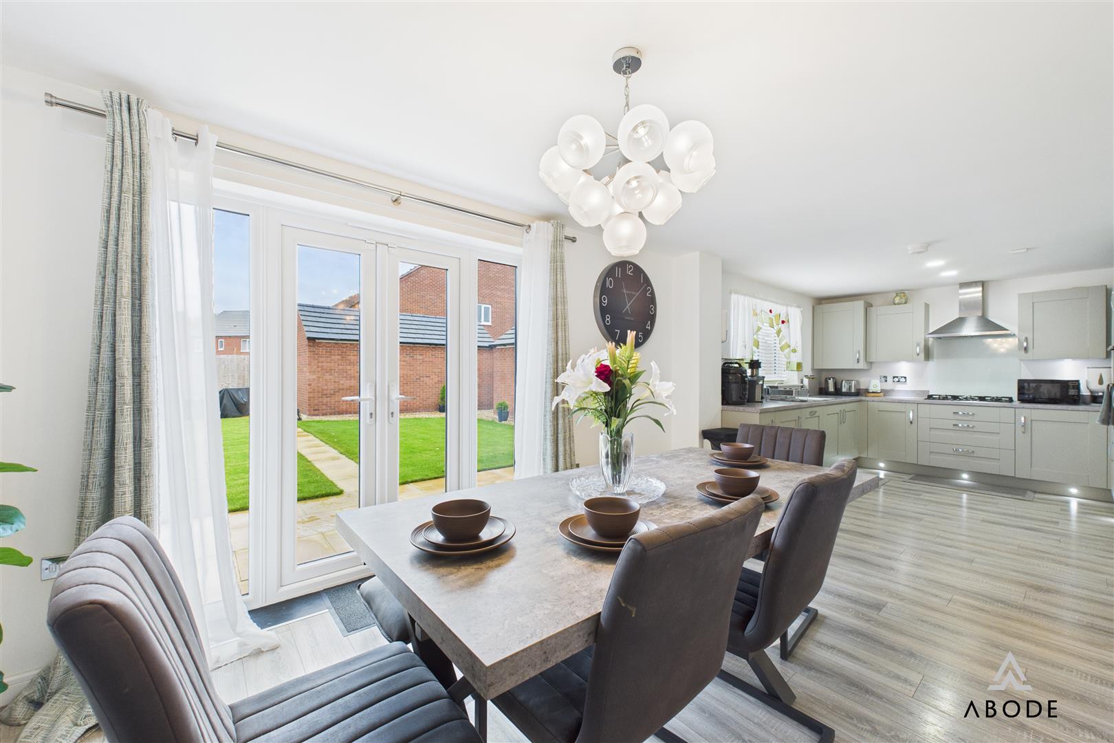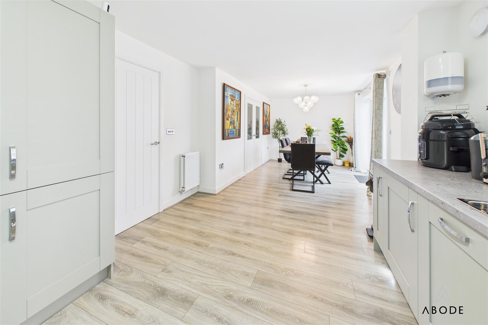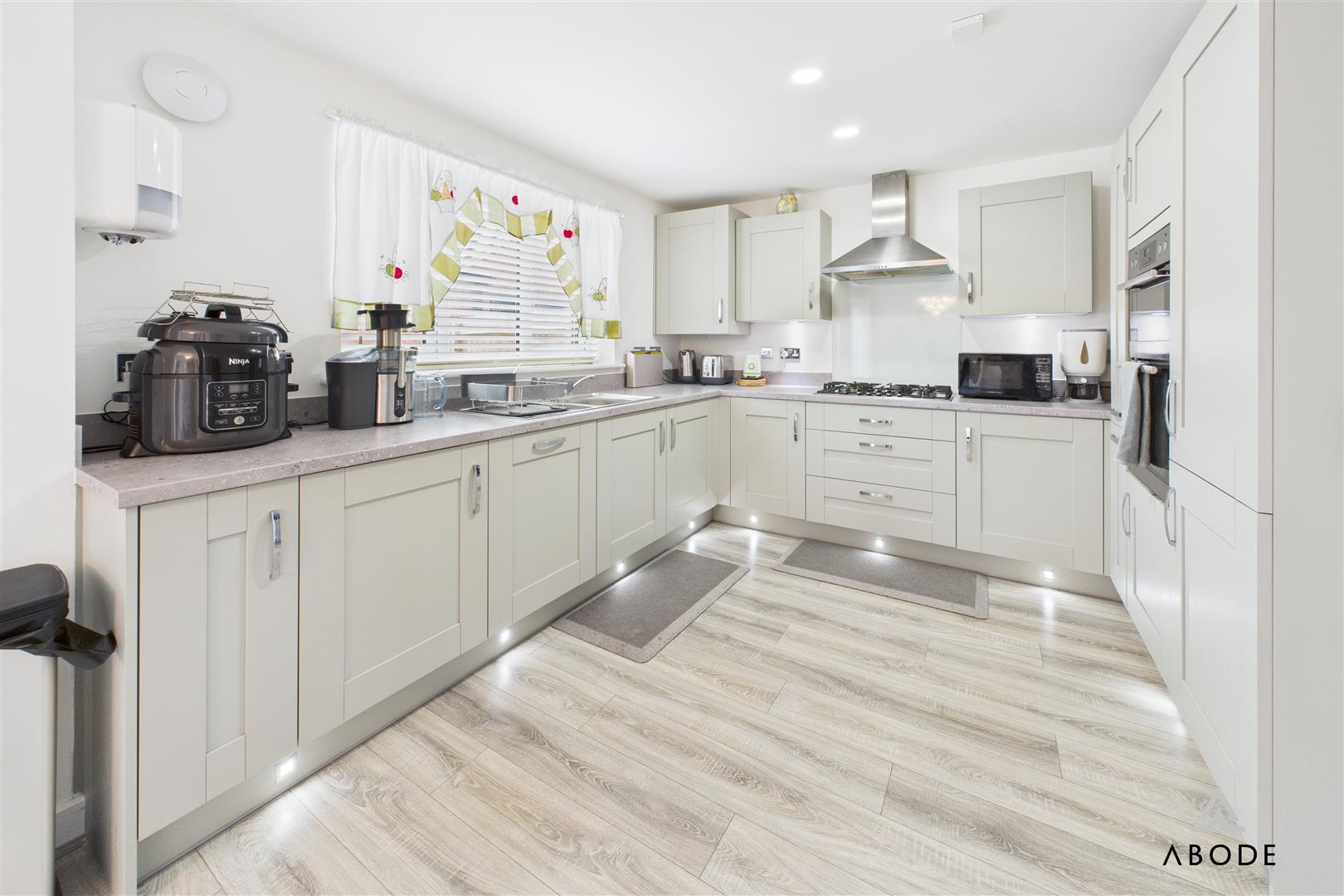 Fitted wall mounted base and drawer units with work surfaces and a stainless steel sink and drainer unit with mixer tap. Fitted electric double oven, five ring gas hob and extractor hood over, integrated fridge freezer and dishwasher. Kick board LED lighting, upvc double glazed window and double doors onto the garden, radiator and a door into the hallway.