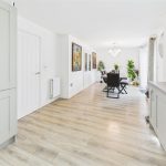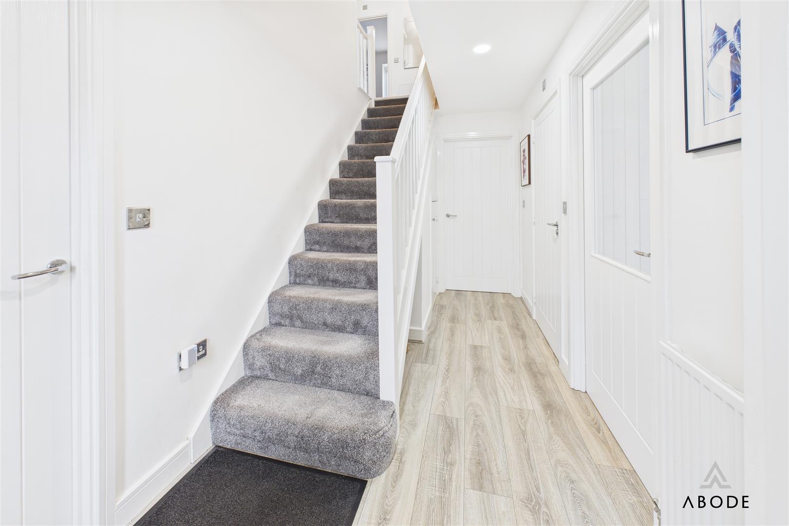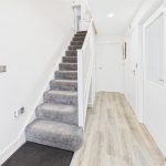 Entrance door into the hallway with stairs to the first floor, under stairs storage cupboard, radiator and doors to -