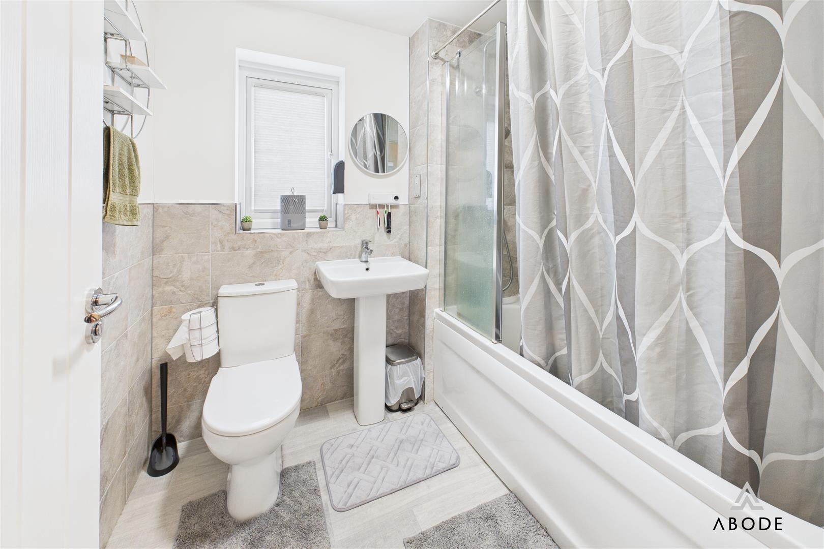 Panel enclosed bath with a shower and shower screen, wash hand basin, low flush wc, chrome ladder style radiator and a upvc double glazed window.