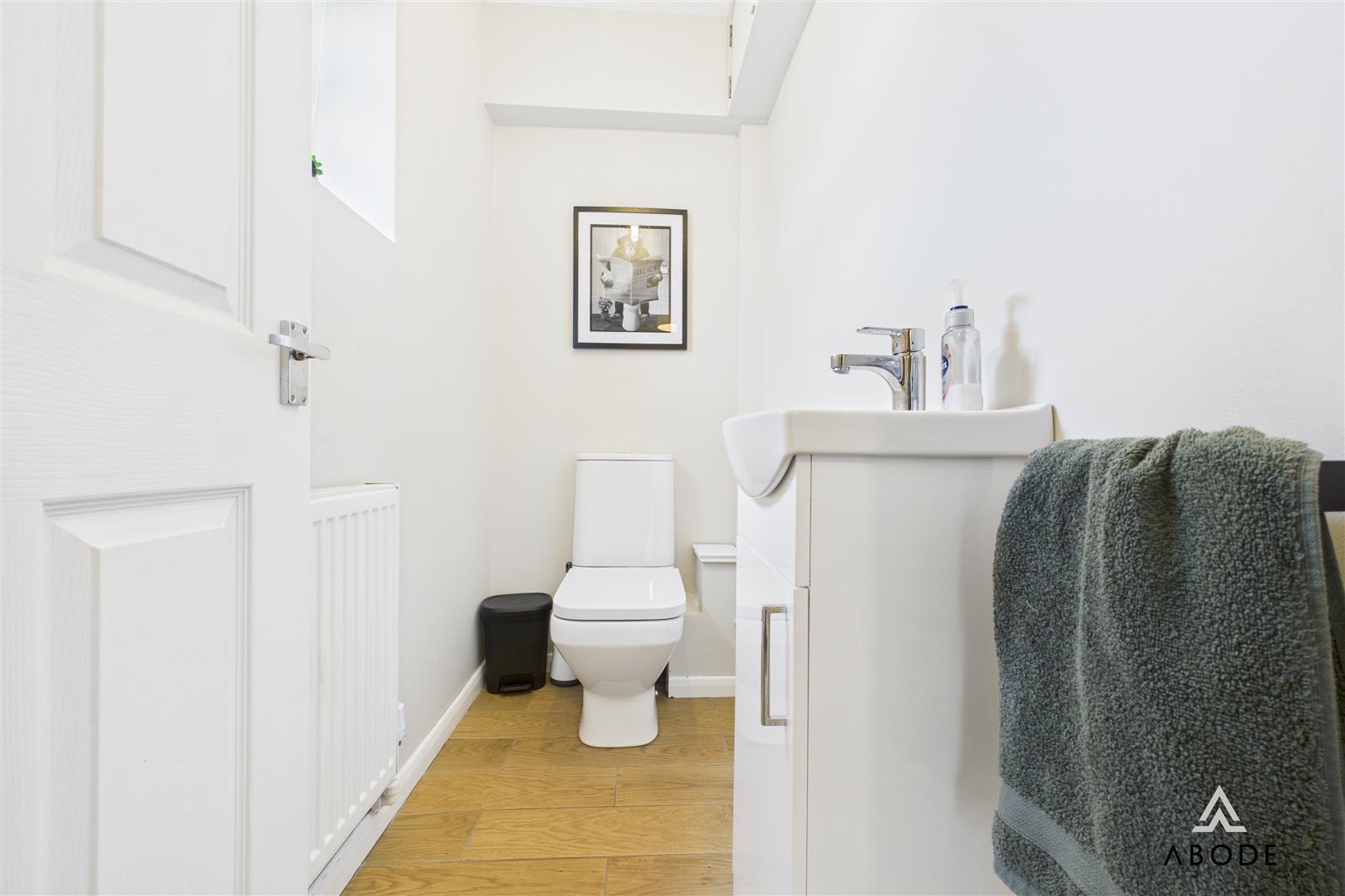 WC and wash hand basin with storage cupboard below, central heating radiator, tiled flooring and UPVC double glazed window to the front elevation.