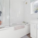 Bath with shower over and glass shower screen, sink with cupboard below, UPVC double glazed window to the rear elevation, tiled walls, towel radiator, extractor fan.