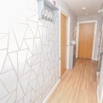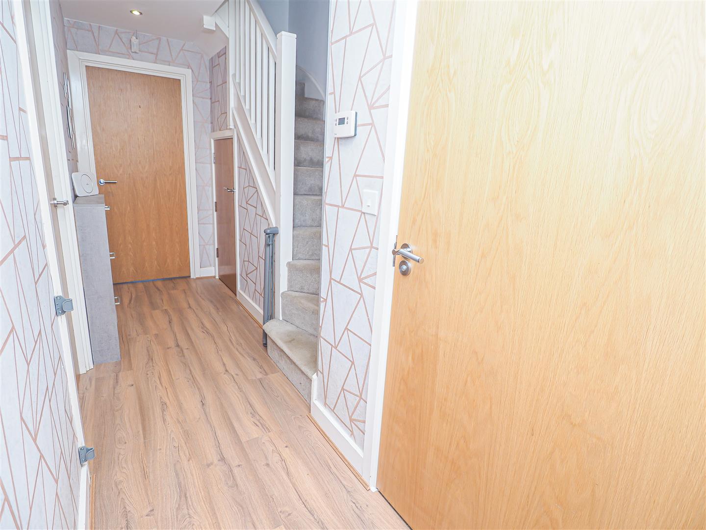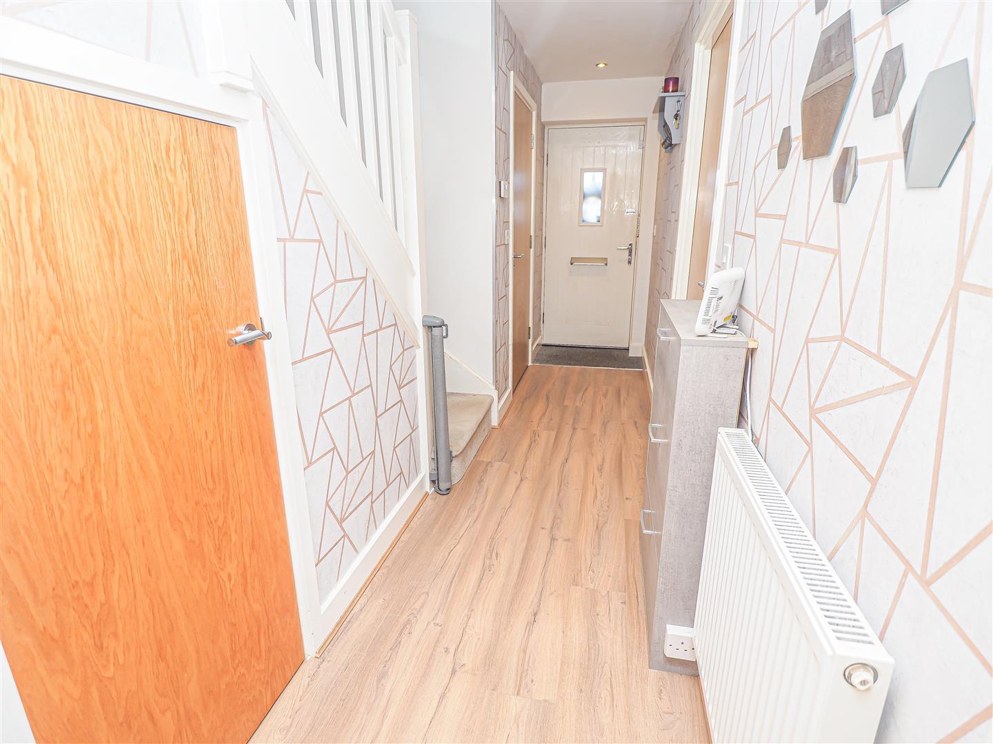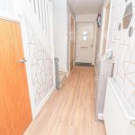 Entrance door into the hall with stairs to the first floor, radiator, storage cupboard and doors to -