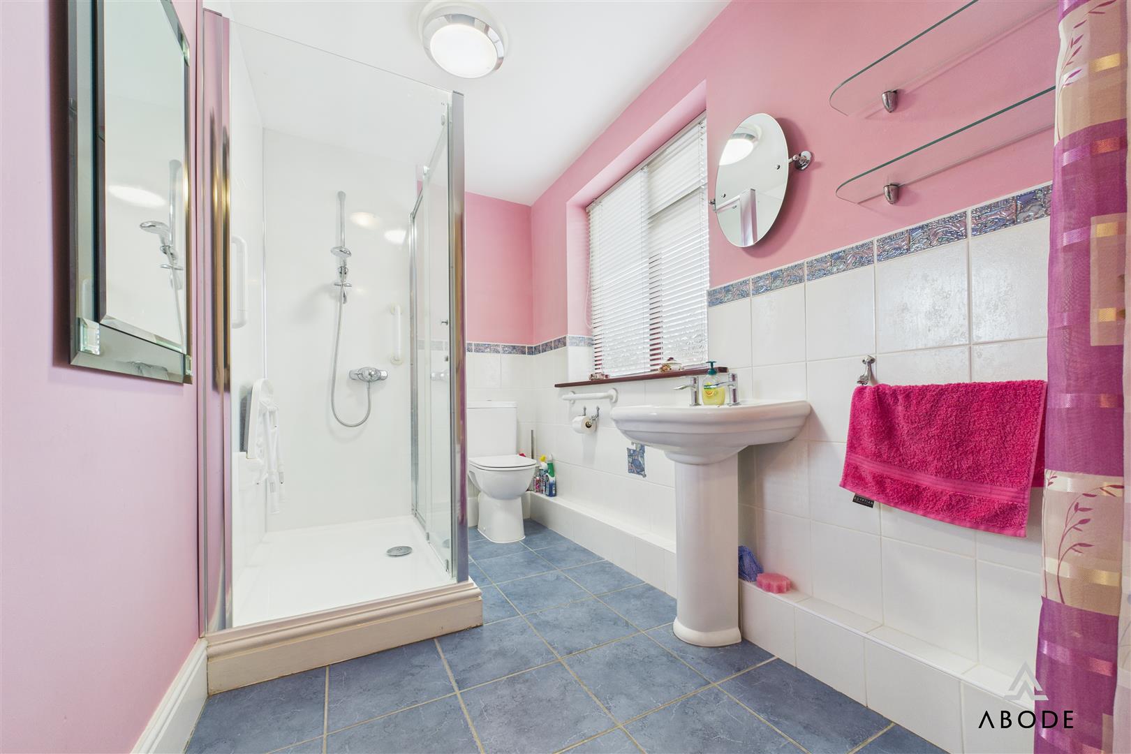 White suite comprising;- WC, wash hand basin, free standing double shower cubicle and bath with additional shower over and glass shower screen. Tiled flooring and partially tiled walls, central heating radiator and wooden double glazed window to the rear elevation.