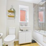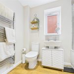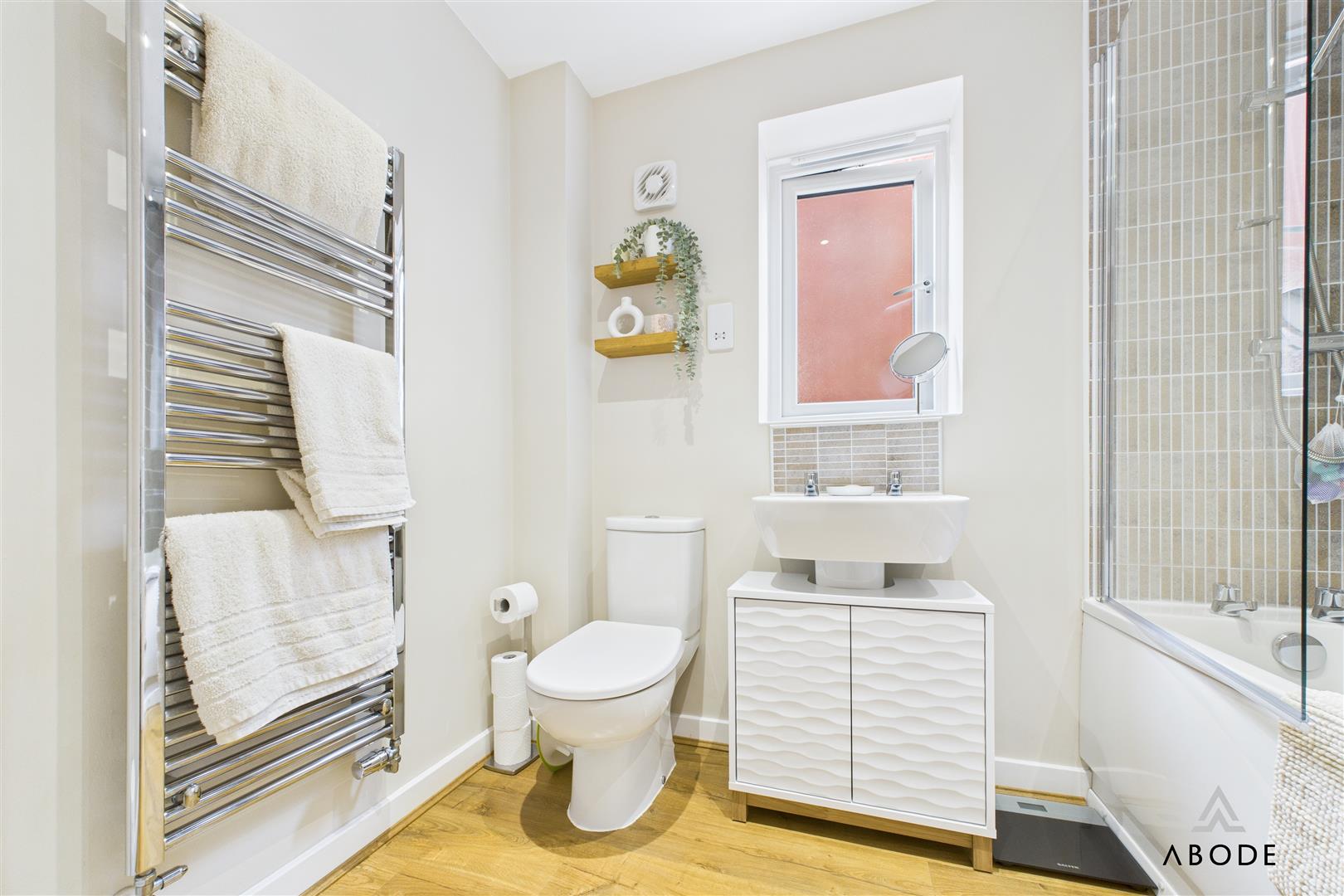 The first floor offers two well-sized bedrooms and a refitted family bathroom. The second bedroom is positioned to the front and benefits from two double-glazed windows and a radiator. The third bedroom overlooks the rear garden and also features a radiator and quality carpet. The bathroom comprises a panelled bath with power shower over and folding screen, a vanity unit with wash hand basin, low-level WC, tiled splash backs, a heated towel rail, extractor fan, and an opaque double-glazed window.