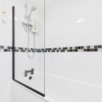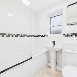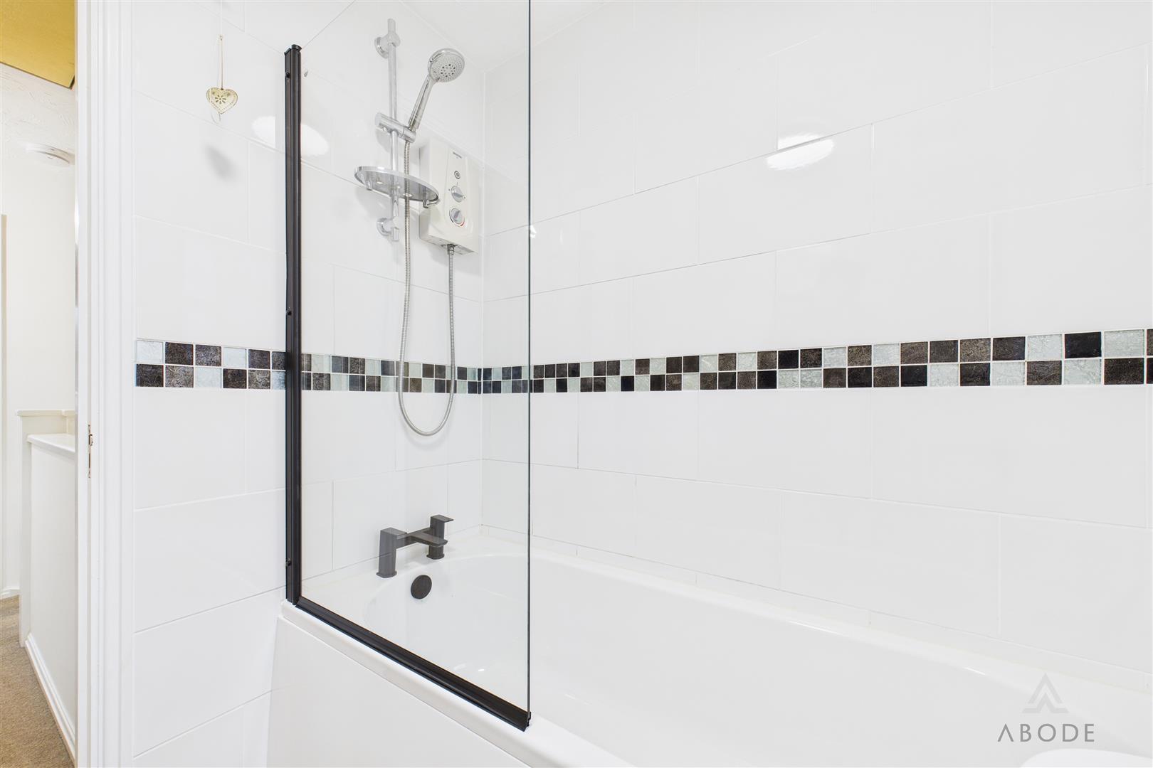 The bathroom is fitted with a three-piece suite comprising a low-level WC with continental flush, pedestal wash hand basin with mixer tap, and a bath with electric shower over and glass screen. The room is finished with tiled wall coverings, a chrome heated towel radiator, shaving point, extractor fan and a UPVC double glazed frosted window to the front elevation.