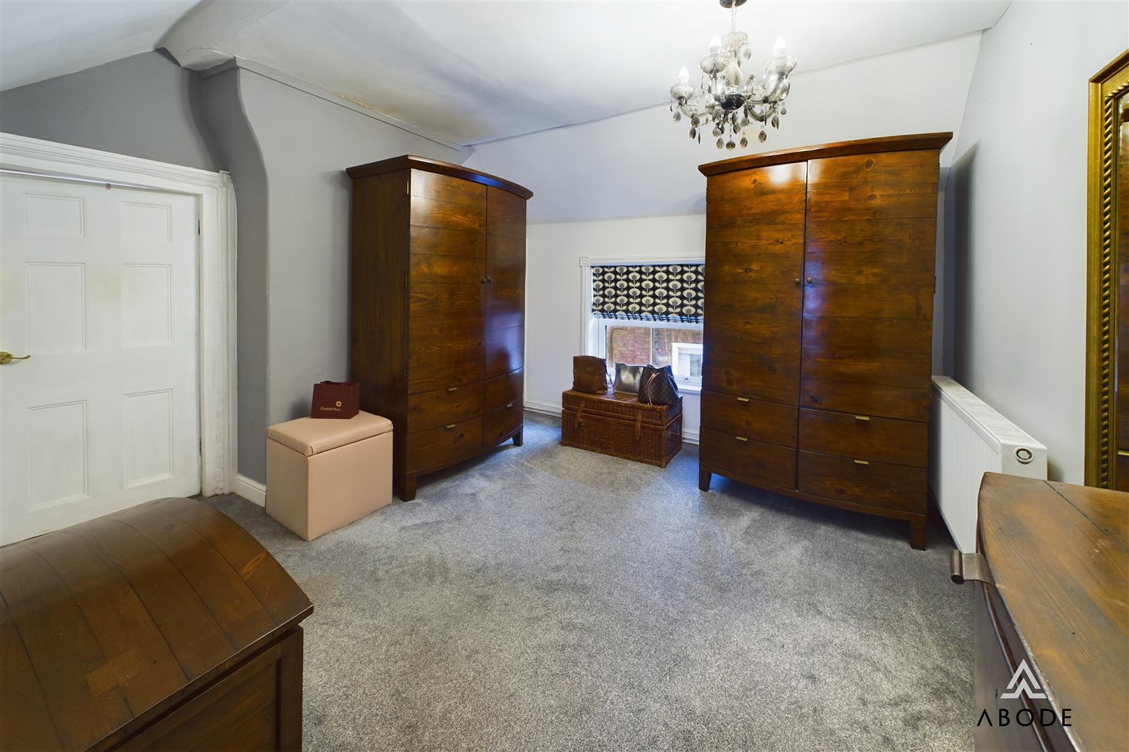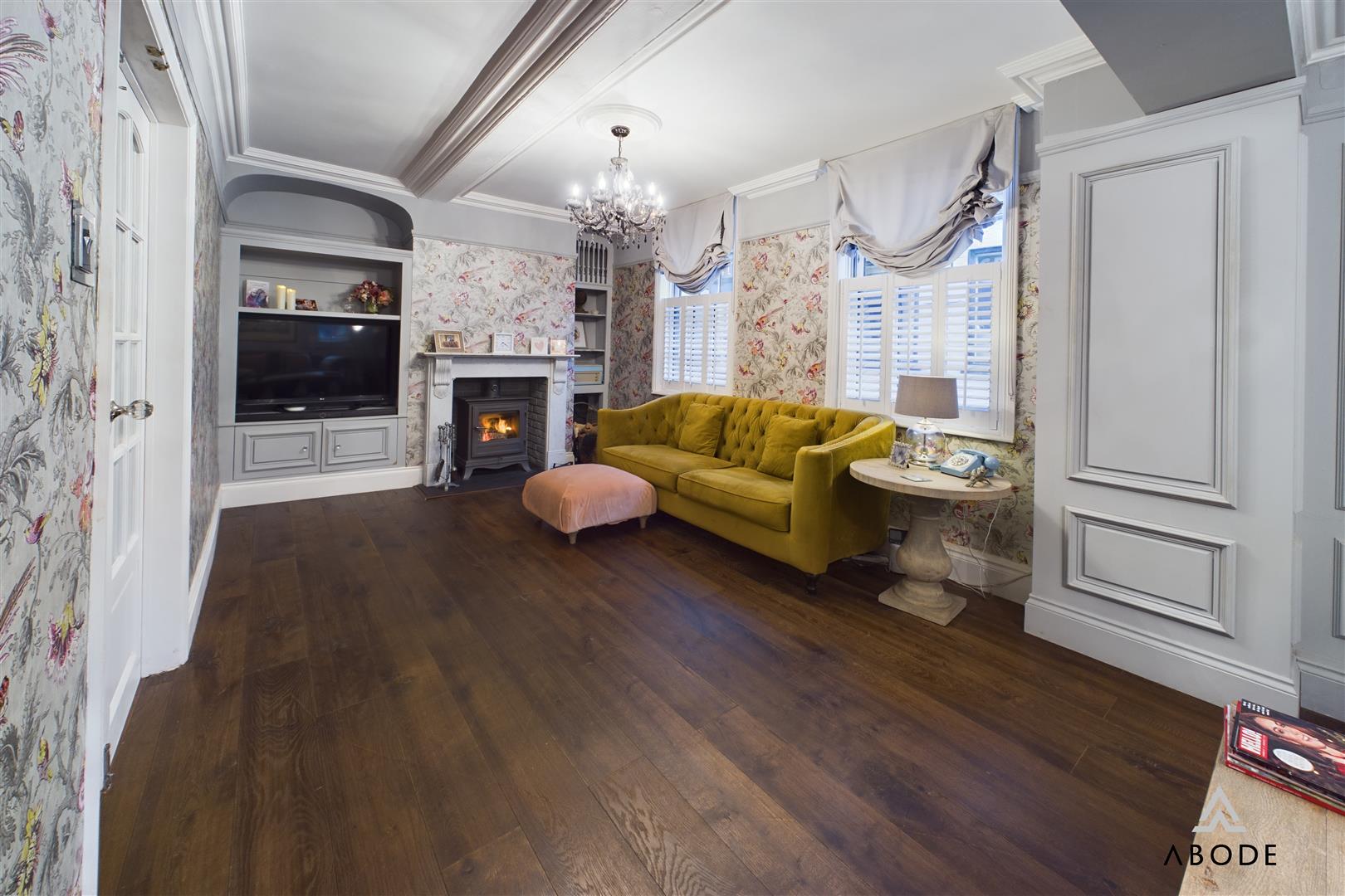 Feature log burner, two sash windows to the front with fitted shutters and two sash windows to the side. Cast iron radiator and wood flooring.