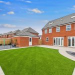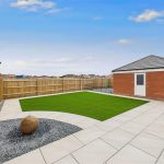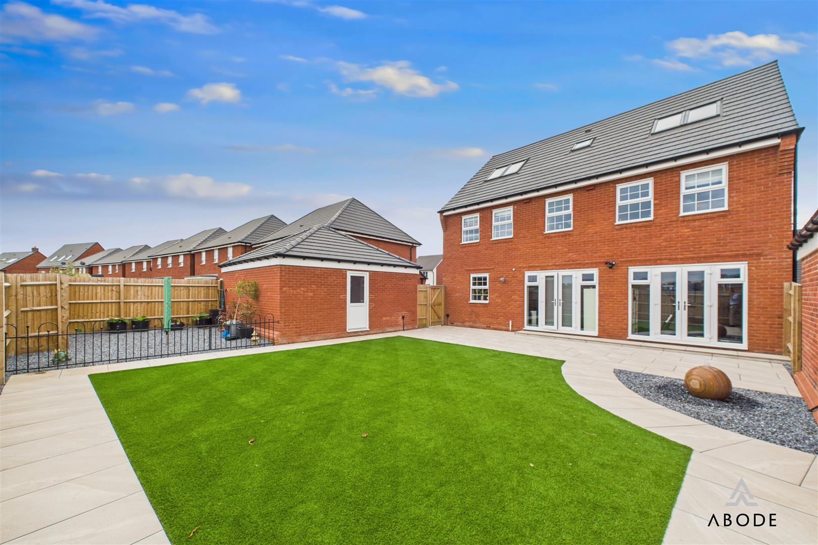 The property is set back behind a landscaped front garden with a pathway leading to the front entrance door. A generous driveway to the side provides ample off-street parking and access to a detached double garage. The rear garden has been landscaped for low maintenance, featuring a large patio area, lawn with artificial grass, and further space for outdoor seating and entertaining.