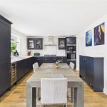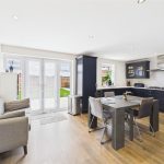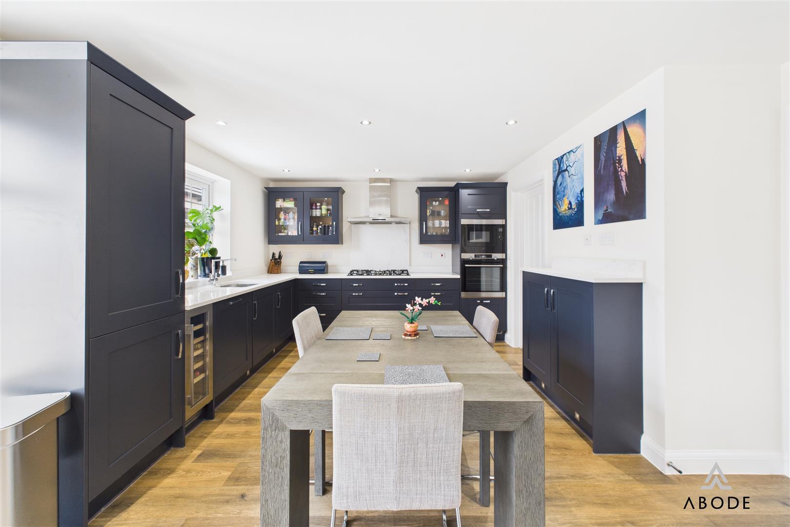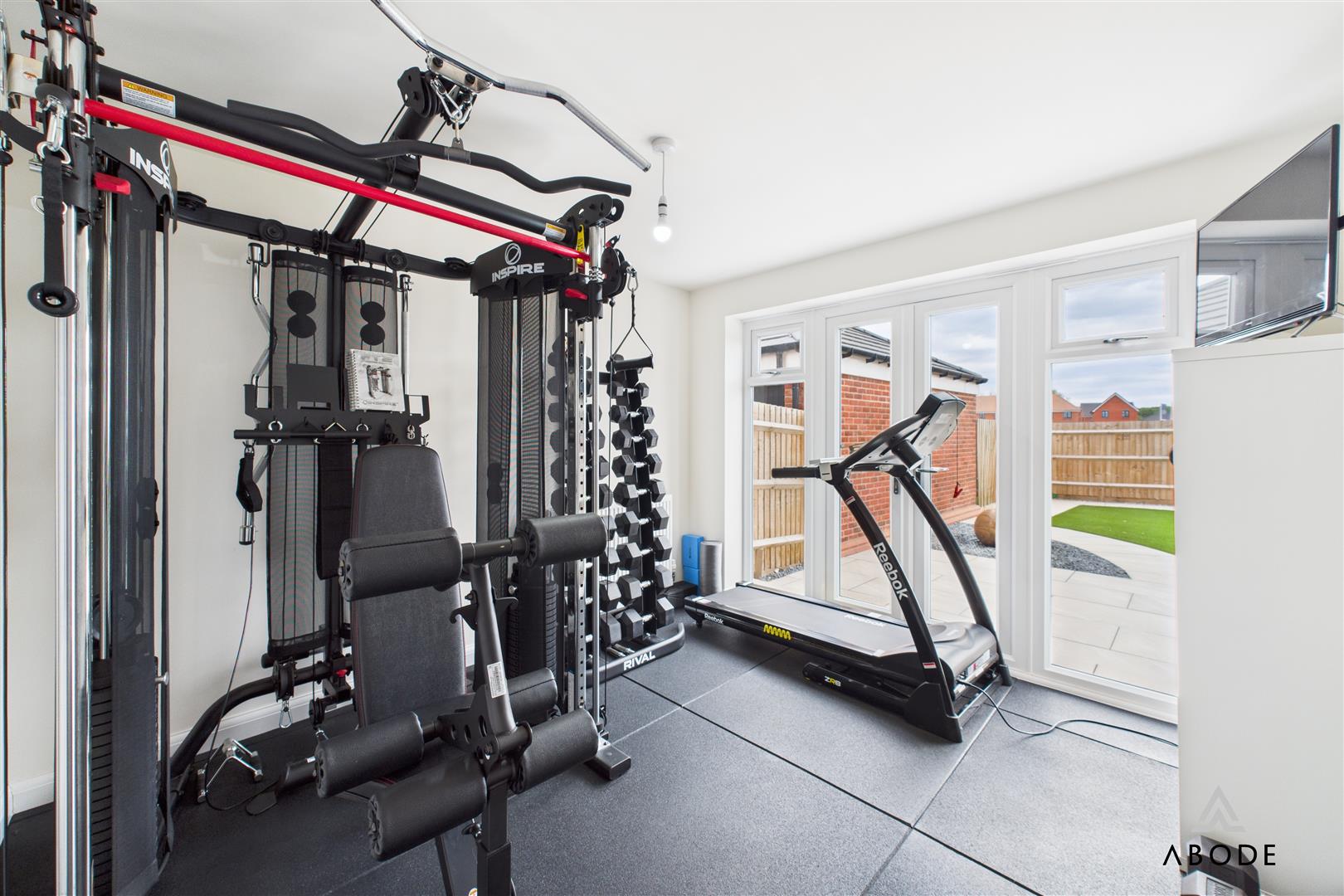 The property is entered via a welcoming hallway with stairs rising to the first floor and access to a ground floor cloakroom. To the front, the spacious living room features dual windows allowing for excellent natural light. A separate study provides a versatile room ideal for home working or quiet retreat currently used as a pantry / storage. The rear of the home is designed with family living in mind, offering a large open-plan kitchen, dining, and living area with French doors leading out to the garden. The kitchen is fitted with a range of high-quality units, integrated appliances, ample preparation space, and room for a dining table and seating area. A separate dining room. (Currently fitted out as a gym) also features French doors to the garden, while a useful utility room with external access completes the ground floor accommodation.
