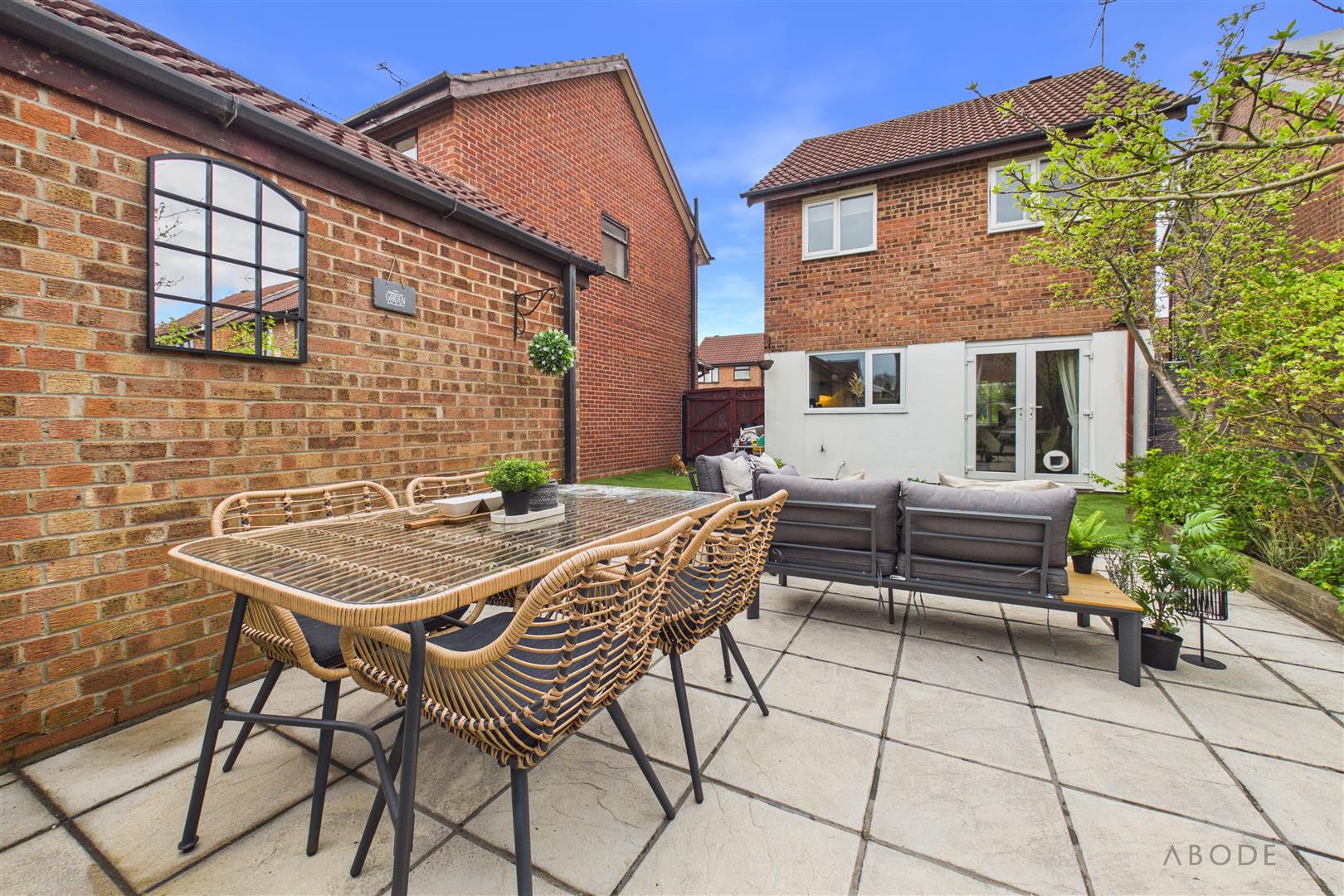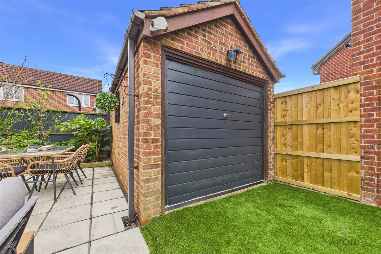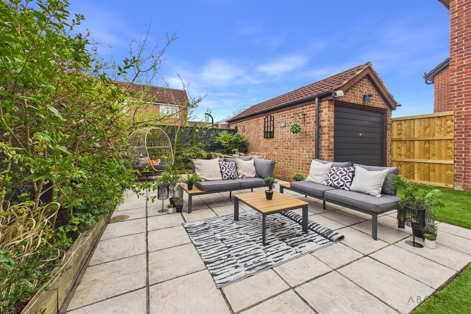 To the rear, the property benefits from a detached garage with an up-and-over door, alongside a spacious paved patio area—ideal for outdoor entertaining—framed by raised, well-stocked borders filled with a selection of established plants.