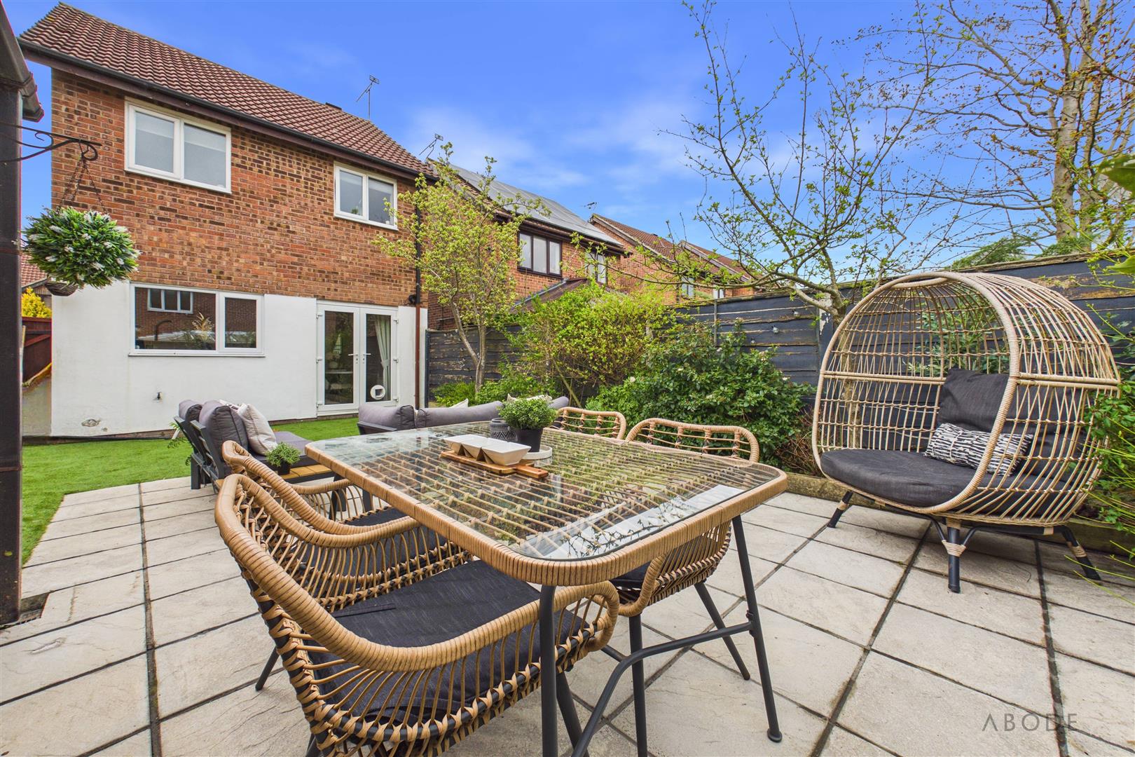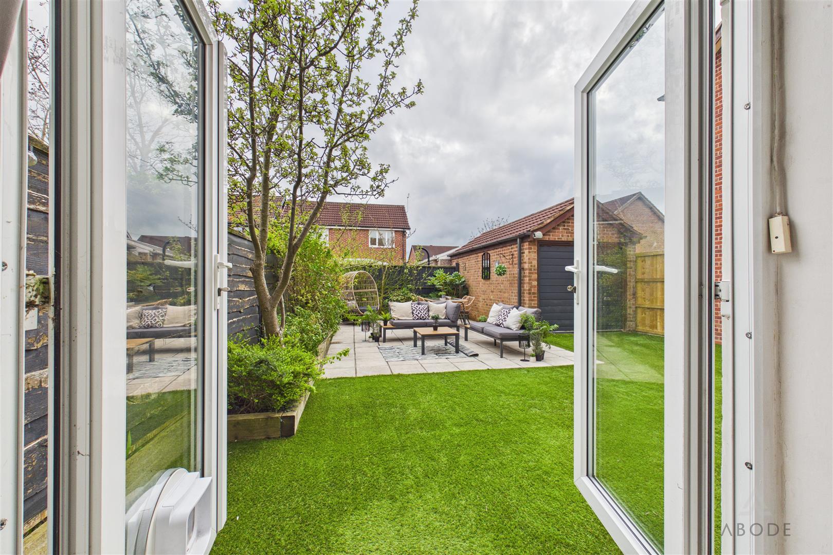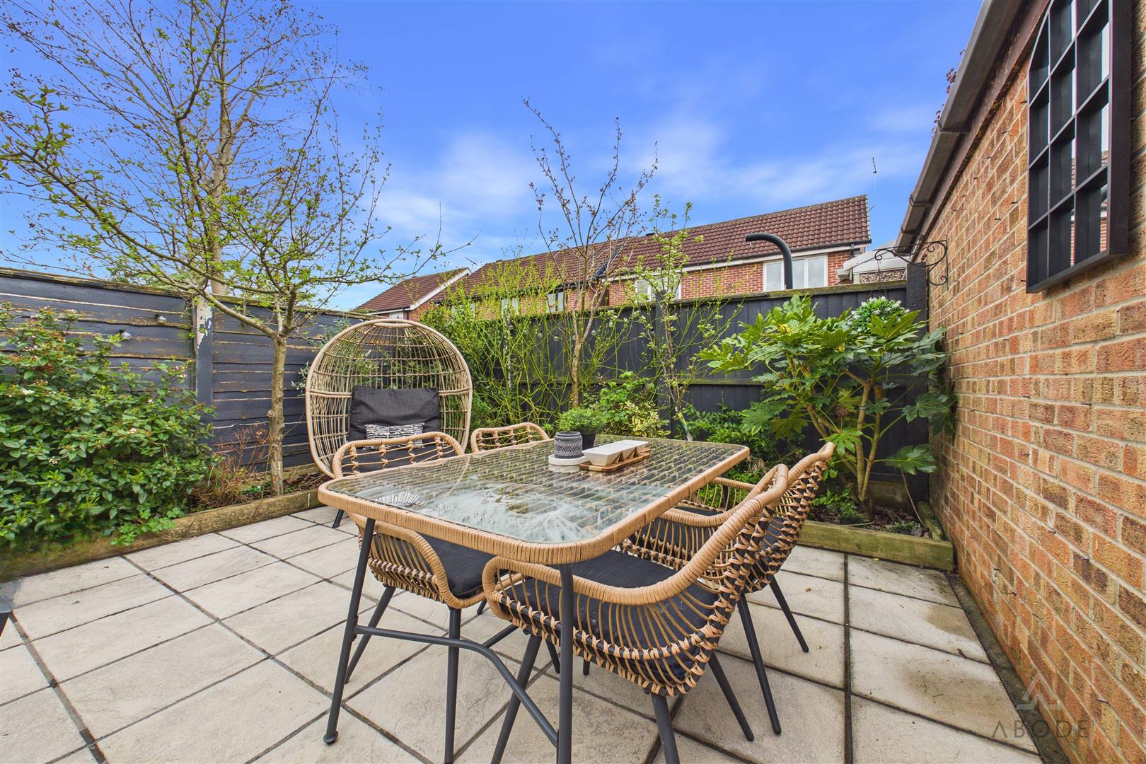 To the rear, the property benefits from a detached garage with an up-and-over door, alongside a spacious paved patio area—ideal for outdoor entertaining—framed by raised, well-stocked borders filled with a selection of established plants.
