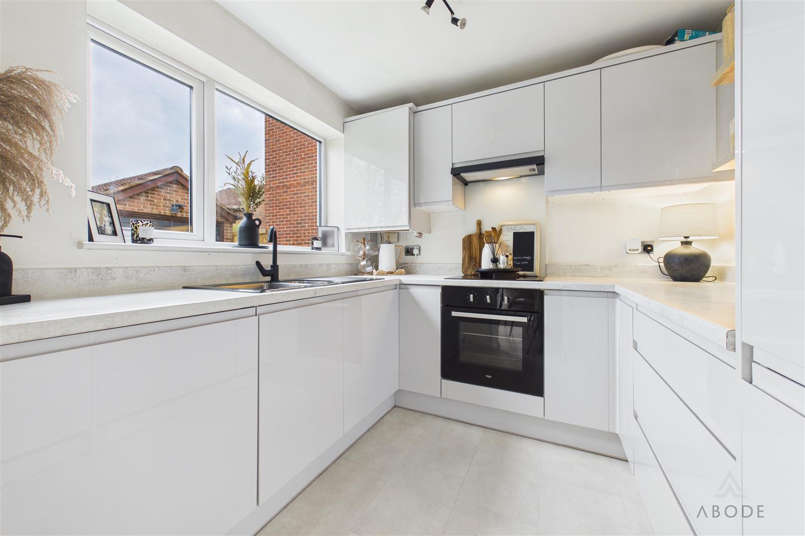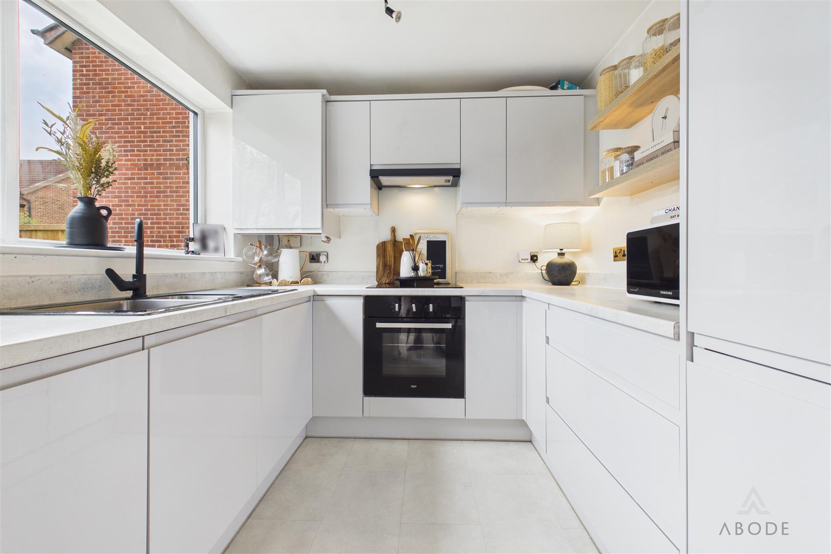 Overlooking the rear garden via a UPVC double glazed window, the kitchen is fitted with a range of modern base and eye-level units with roll-top work surfaces. Integrated appliances include a stainless steel sink with mixer tap, fridge, freezer, cooker, electric hob with extractor hood, and a central heating combination gas boiler.