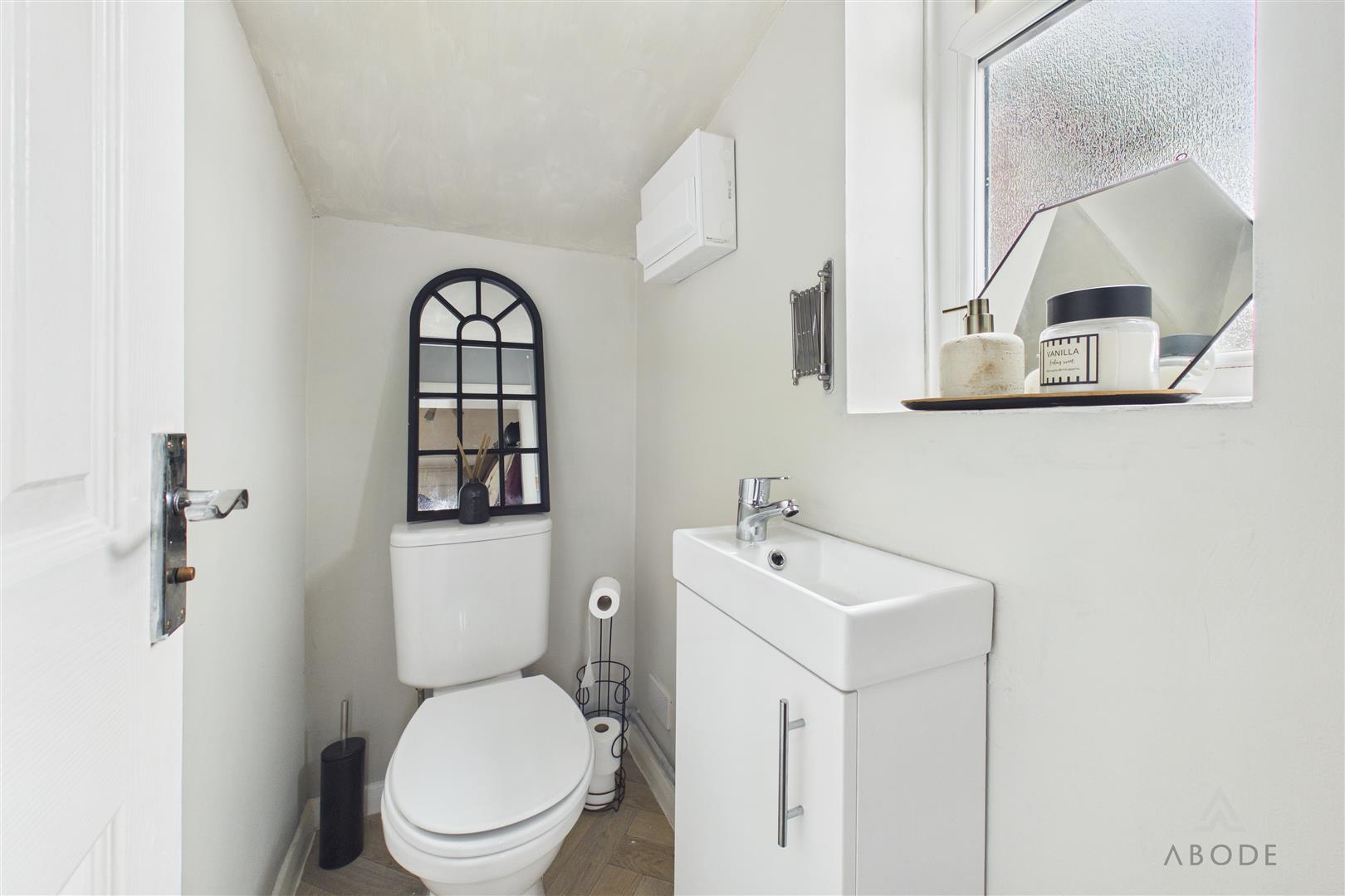 Fitted with a low-level WC with continental flush, wash hand basin with mixer tap, central heating radiator, and a UPVC double glazed frosted window to the side elevation. The electrical consumer unit is also located here.