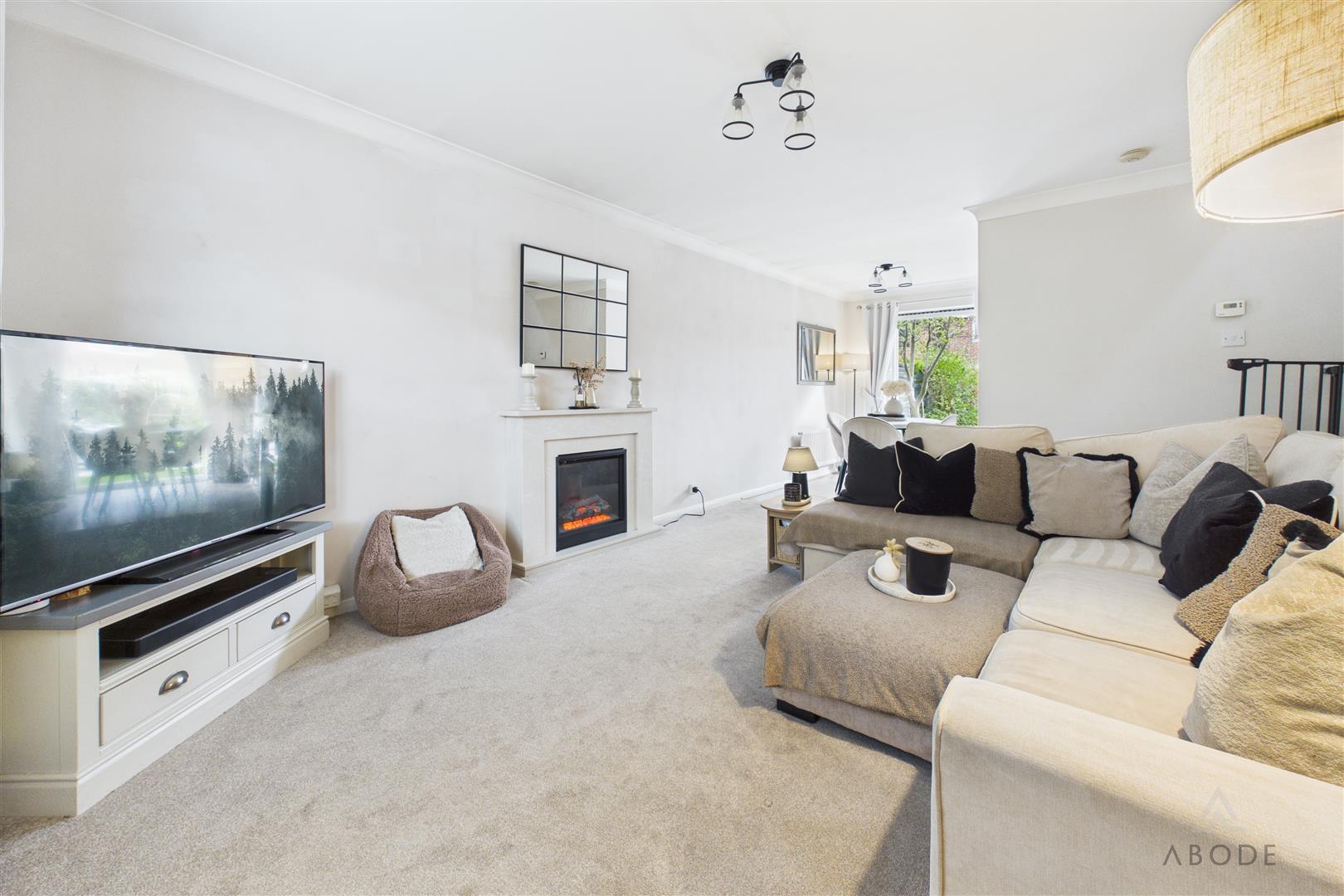 A bright and spacious living area featuring a UPVC double glazed window to the front elevation, central heating radiator, TV aerial point, and an attractive electric fireplace as a focal point. The space opens into a dining area with an additional radiator and UPVC double glazed doors leading out to the rear garden.