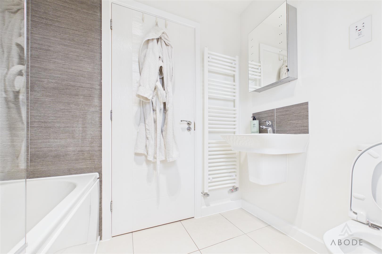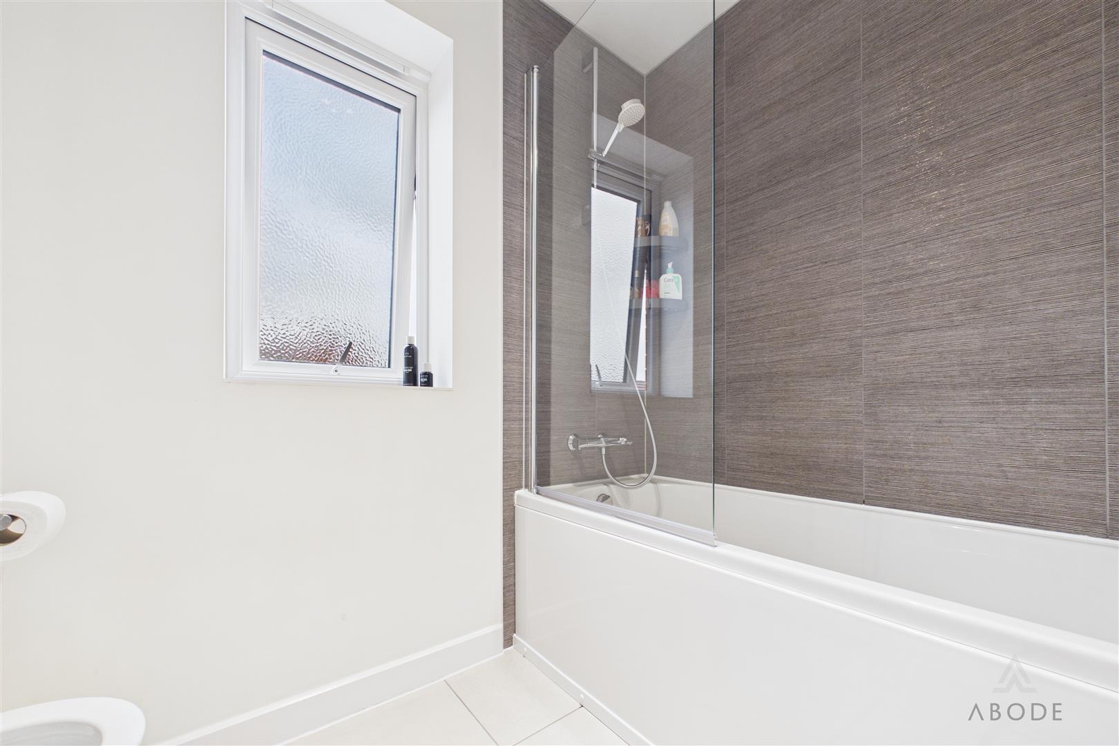 The bathroom is fitted with a modern three-piece suite comprising a bath with shower over, wash hand basin, and low-level WC, finished with contemporary tiling.