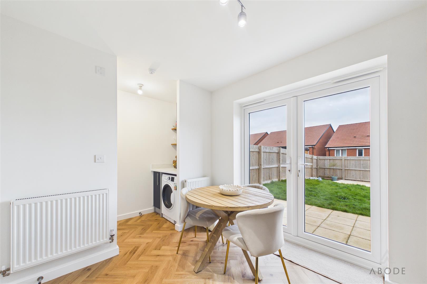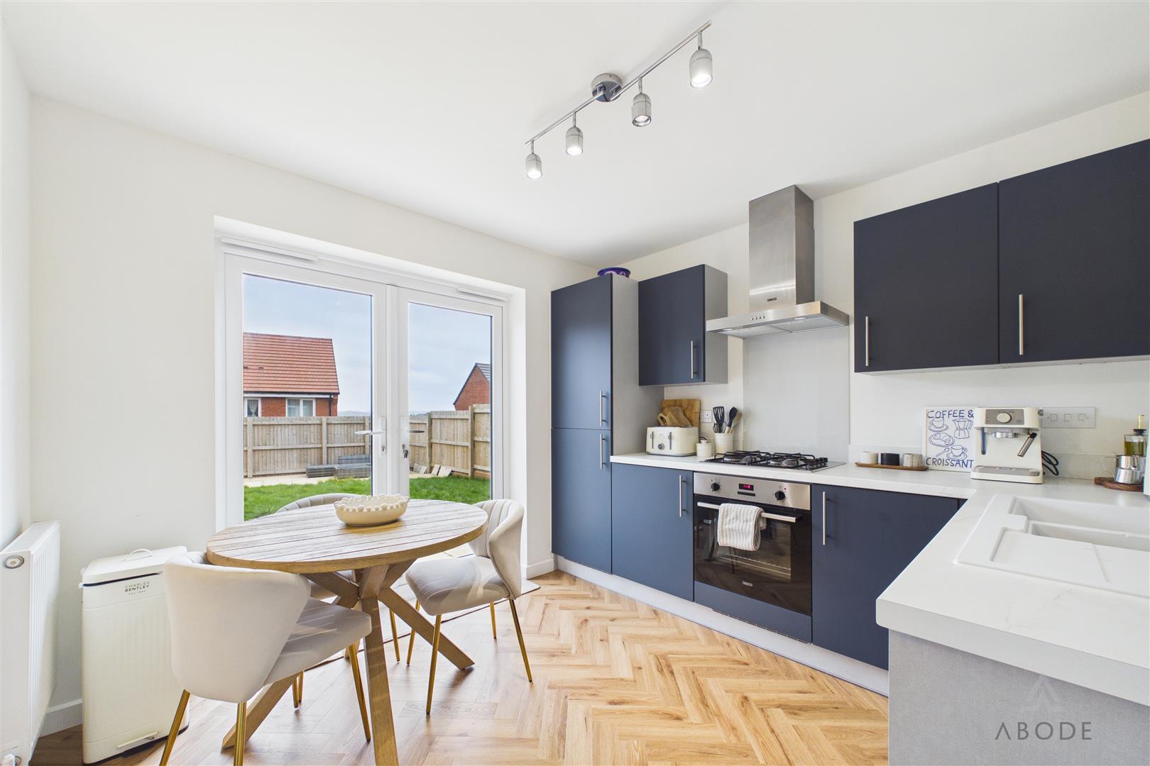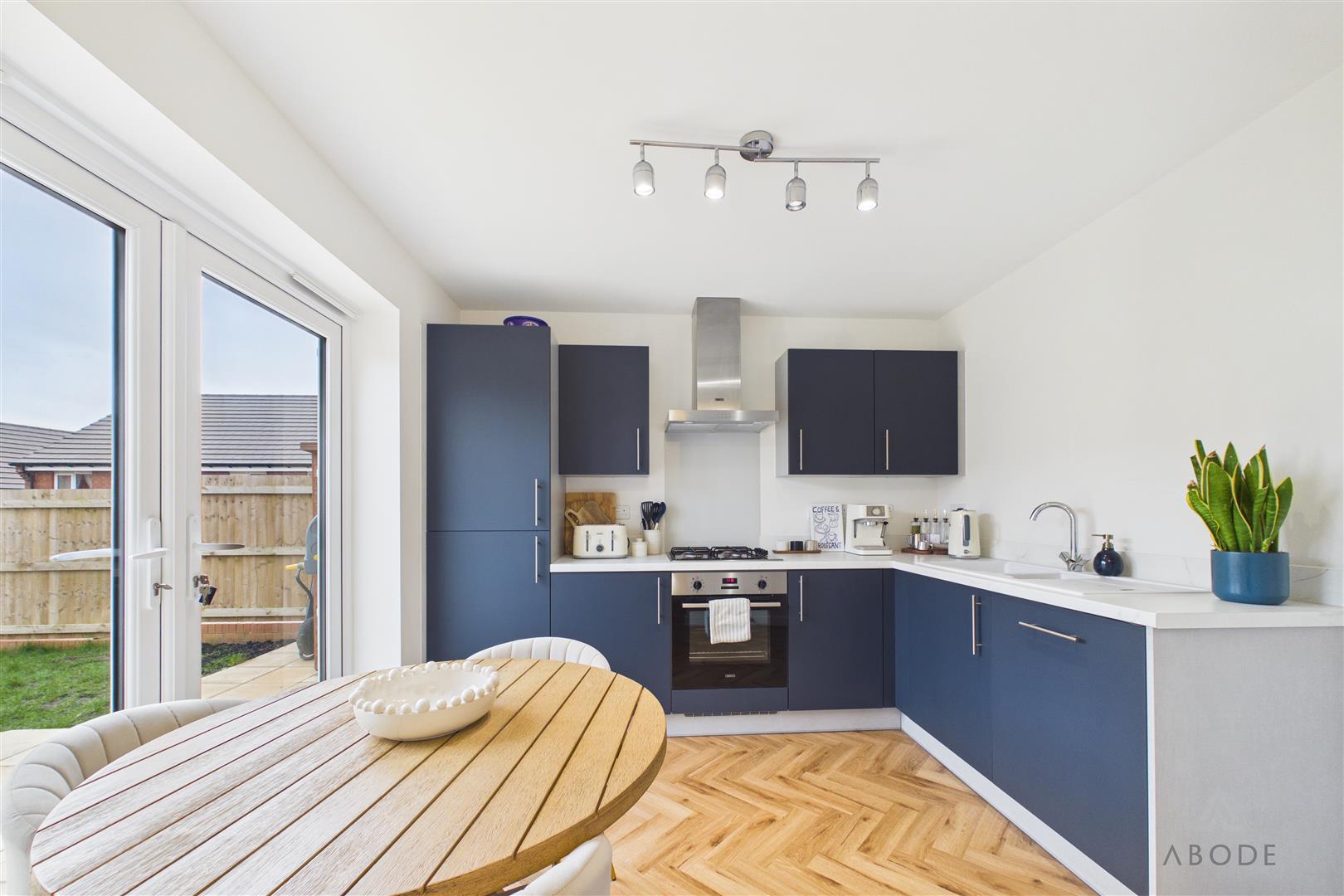 To the rear of the property is the kitchen, fitted with a range of modern wall and base units, integrated oven, gas hob with extractor over, and space for additional appliances. The layout allows room for a dining table, creating a sociable kitchen/diner. Double doors lead directly out to the rear garden, enhancing the connection between indoor and outdoor living.