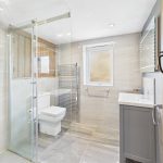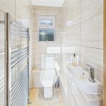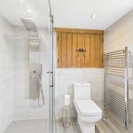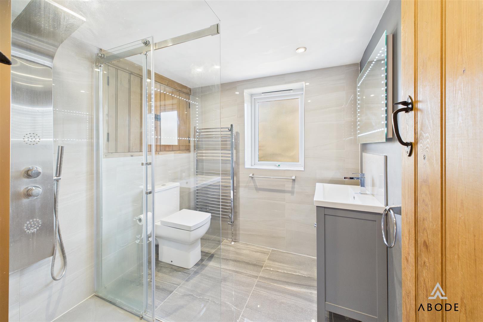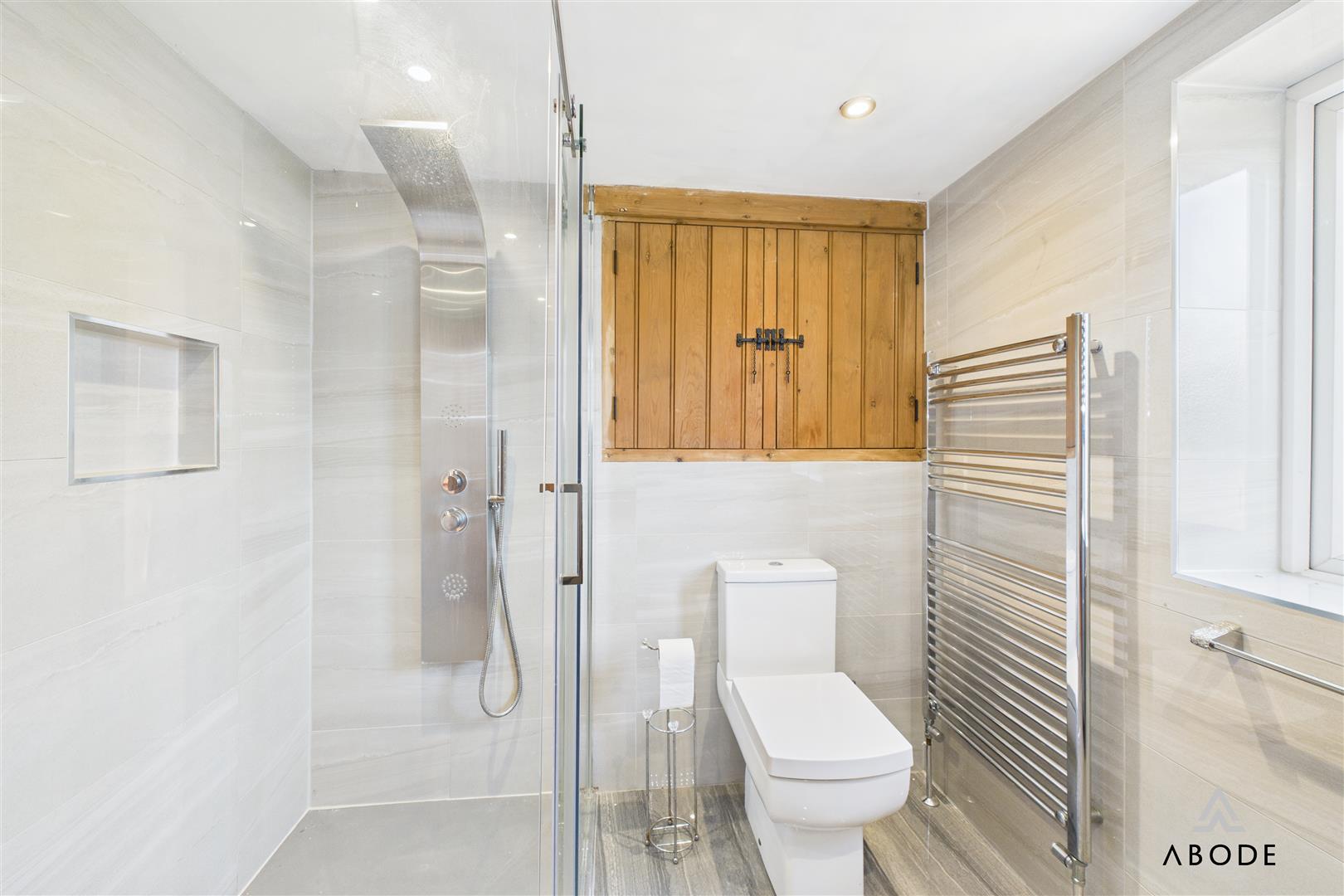 To the first floor, the main landing leads to the principal bedroom, a spacious double room with fitted wardrobes and a lovely garden outlook. The adjoining shower room comprises a walk-in double shower, wash basin with storage, WC, heated towel rail, and full tiling. A second double bedroom is accessed from the main landing and also has dual access from the secondary staircase.