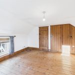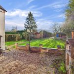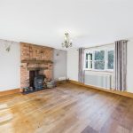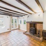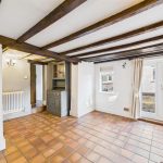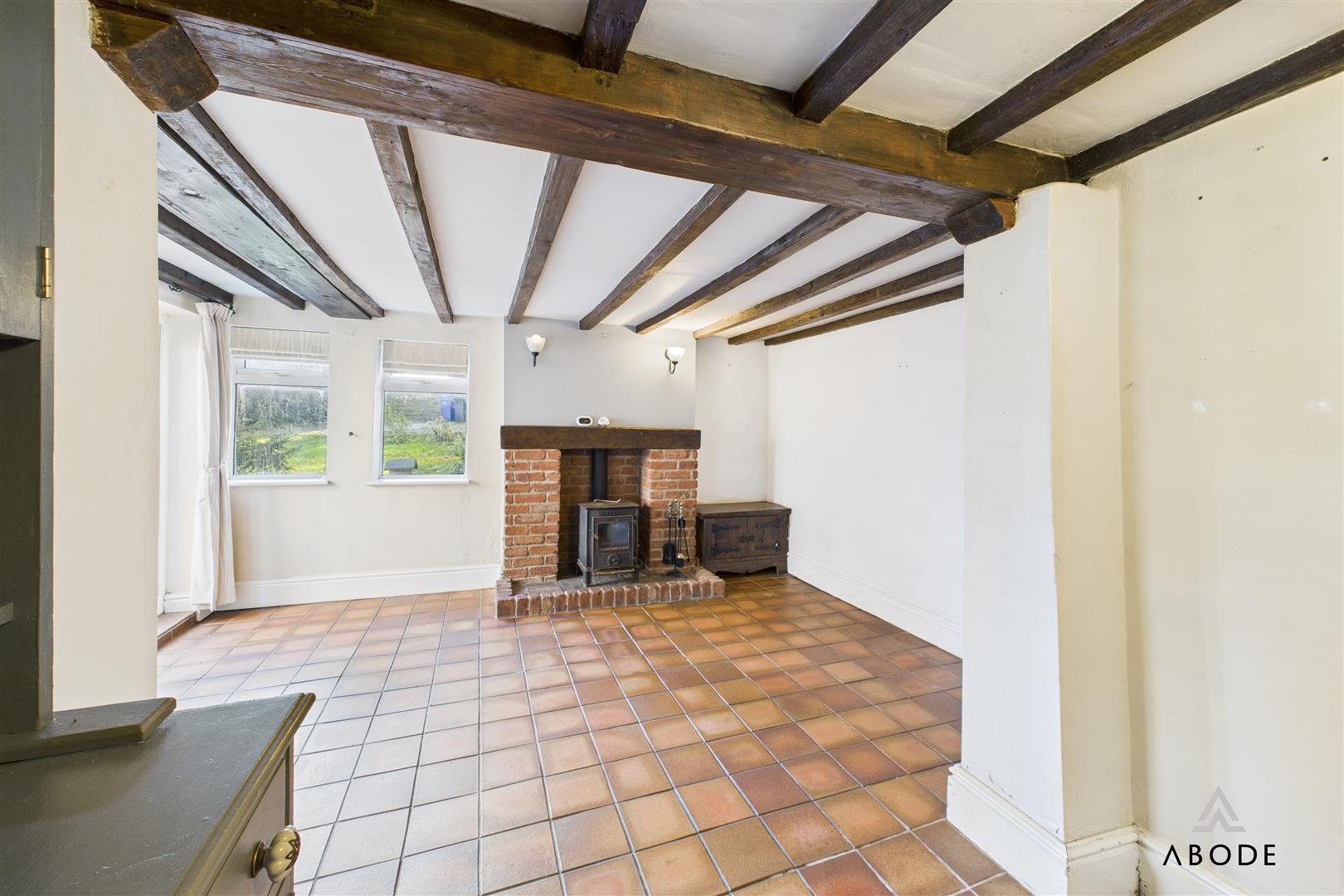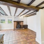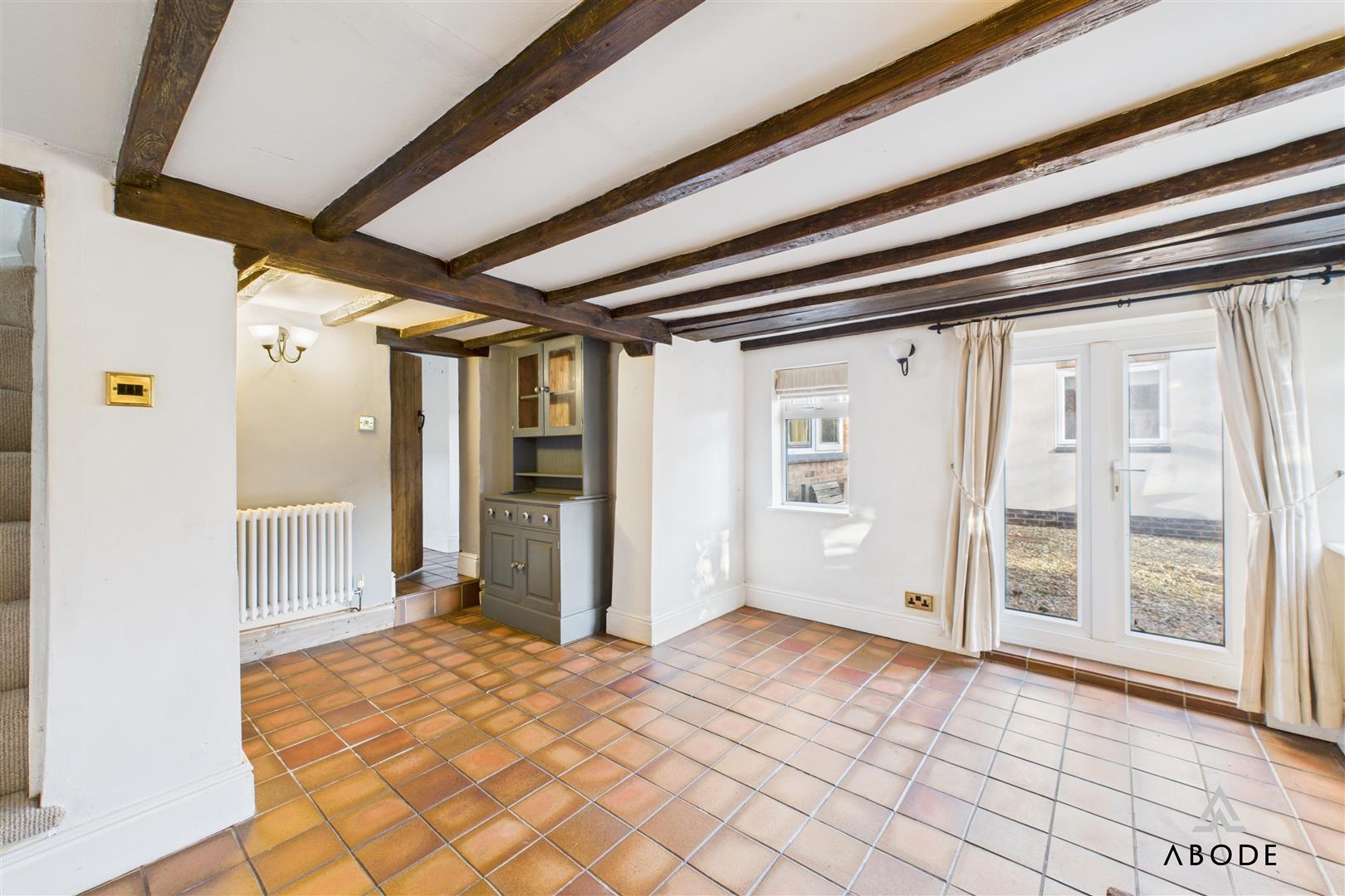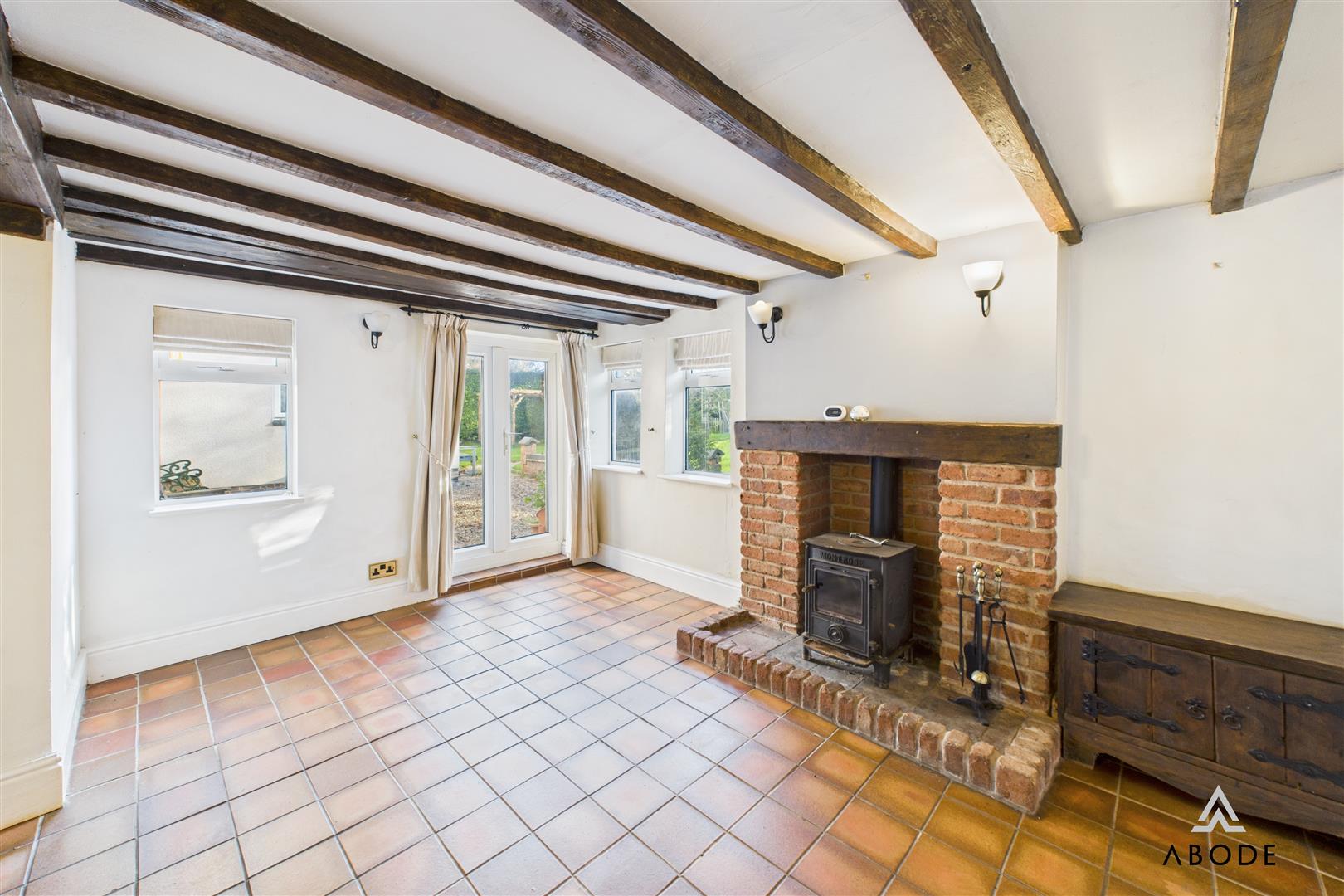 The front-facing lounge enjoys views over the mature gardens and features wood flooring, a wood-burning stove set within a brick chimney breast, and period-style radiators, creating a warm and welcoming space. Adjacent is the snug/dining room, rich in character with its exposed beams, quarry-tiled floor, and a further wood-fired stove. French doors open directly onto the garden, and a secondary staircase rises to the additional first-floor bedrooms.