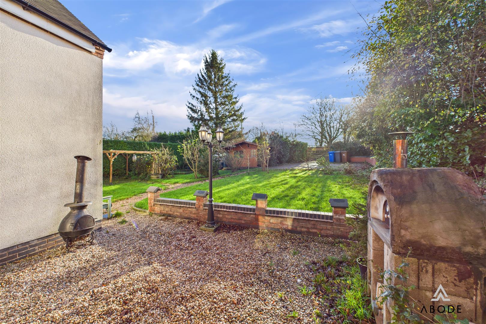 Outside, the home stands on an established corner plot with mature lawns, planting, and a sunny southerly aspect to the main garden. A substantial block-paved driveway provides ample parking, while the timber-built cabin — complete with power and lighting — offers excellent flexibility as a home office, studio, gym, or additional entertainment space.
