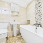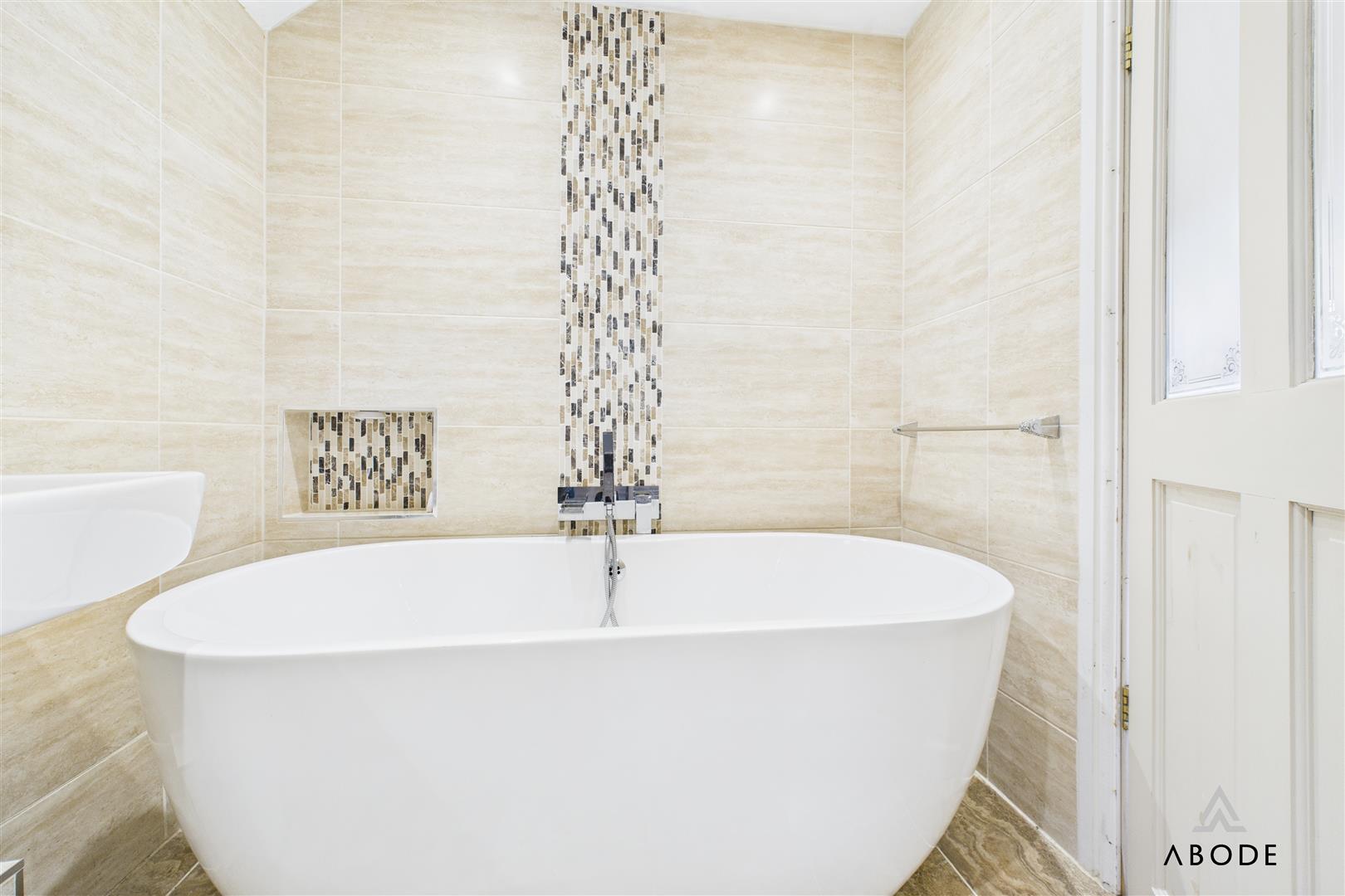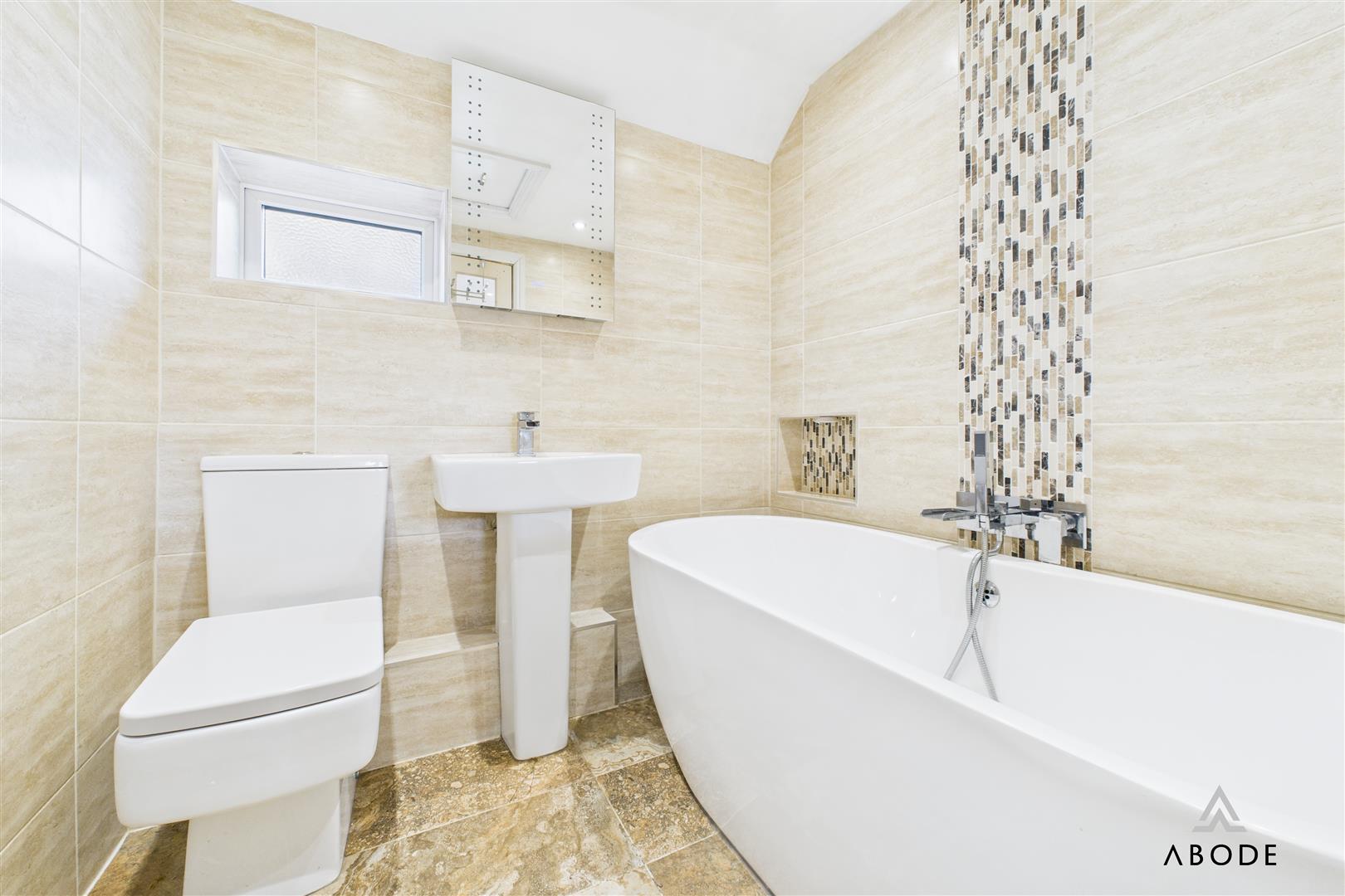 The additional landing, accessed via the dining room stairs, leads to two further bedrooms positioned to the front and rear elevations. The bathroom serves this side of the property and is fitted with a wash basin, WC, and bath with mixer shower attachment, with tiled walls and flooring.