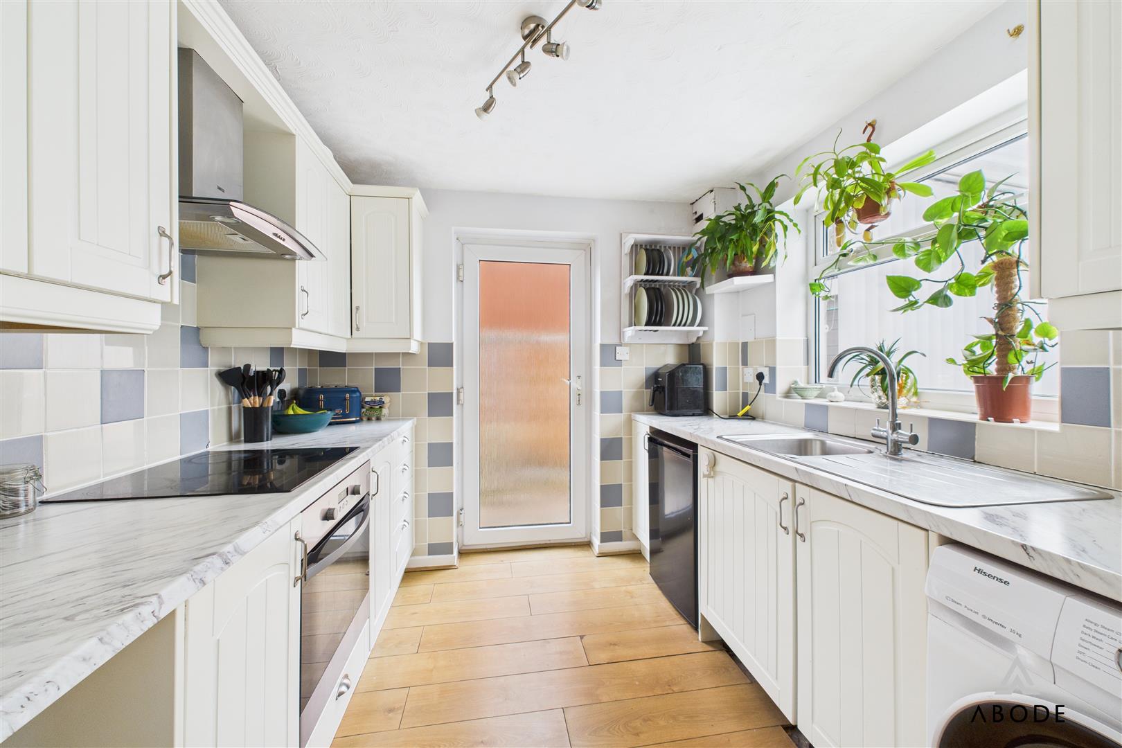The property is approached via a front entrance door opening into a welcoming hallway. From here, a door leads into the spacious living room, which is fitted with wood-effect flooring and features a stone fireplace with a modern stove-style fire, complemented by a large front-facing window offering plenty of natural light. An opening flows through to the dining area, providing ample space for a dining table, with French doors leading into the conservatory. The fitted kitchen is located just off the dining area and is equipped with a range of matching wall and base units with complementary work surfaces, integrated oven, hob with extractor over, sink and drainer, tiled splashbacks, and space for appliances. The conservatory overlooks the rear garden and provides an excellent additional reception space, ideal for year-round use.