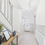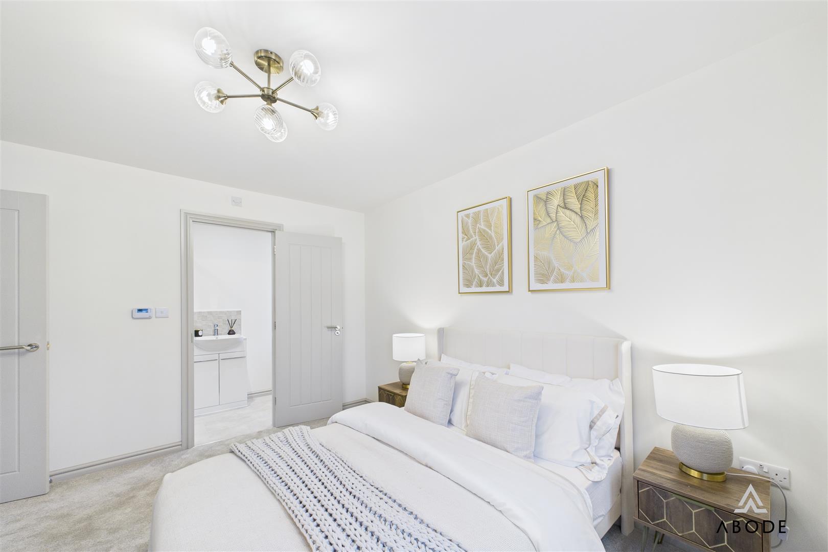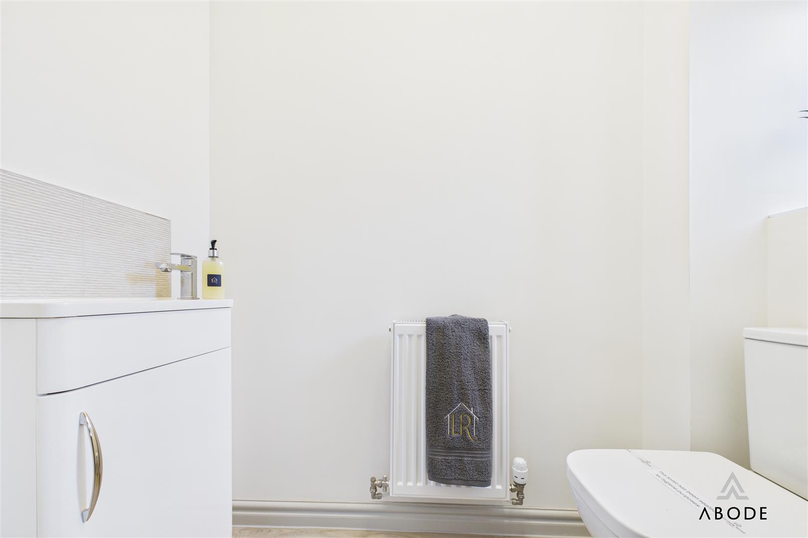 The bathrooms and en-suites are completed with designer white vanity units, and modern chrome fixtures, including heated chrome towel radiators. The main bathroom features a thermostatic mixer shower over the bath with a screen, while the downstairs WC includes a wall-mounted basin with a chrome bottle trap. Hard flooring is fitted in all bathrooms and en-suites as standard, with further flooring upgrades available throughout the rest of the home.