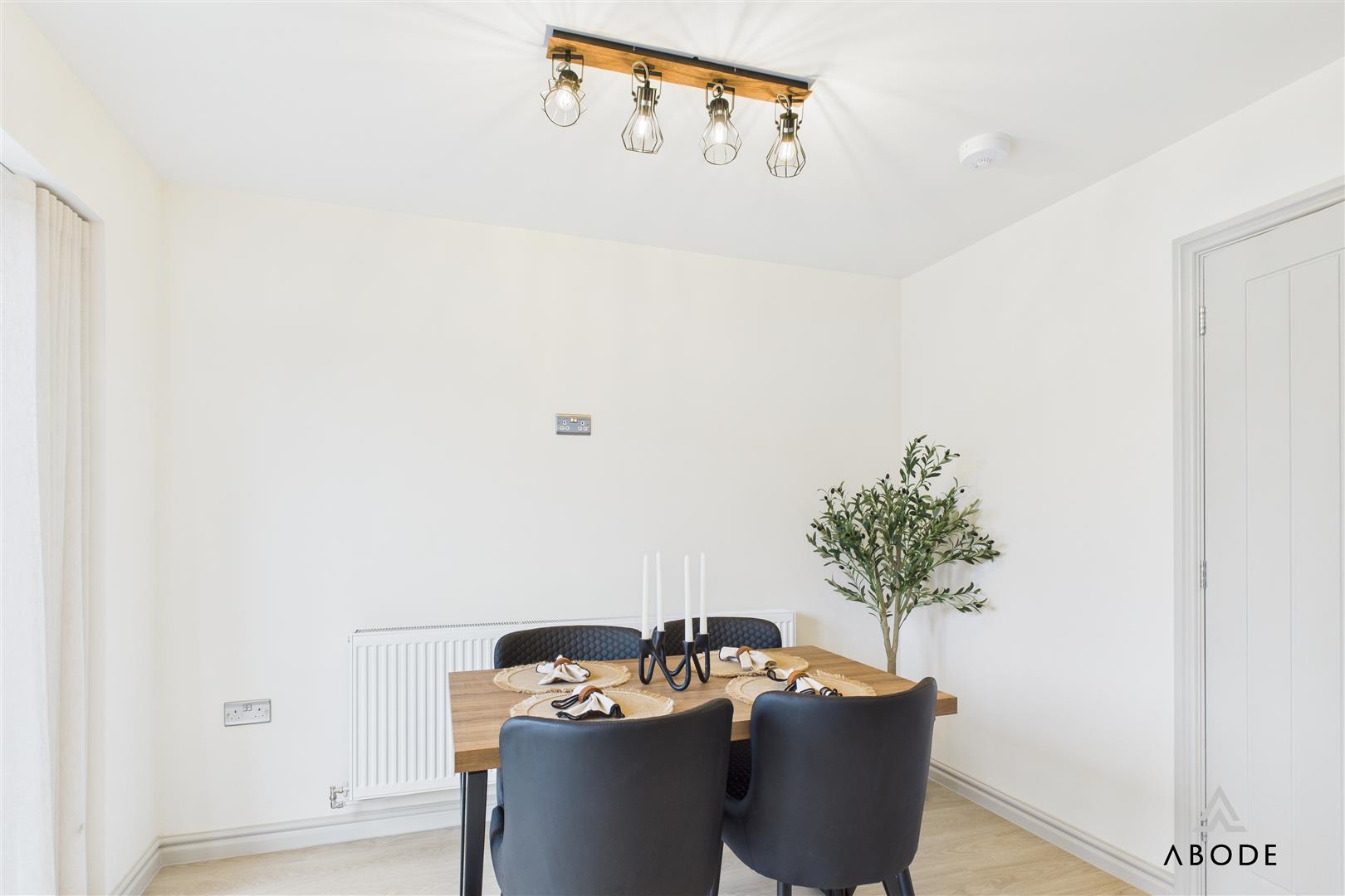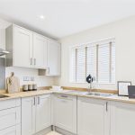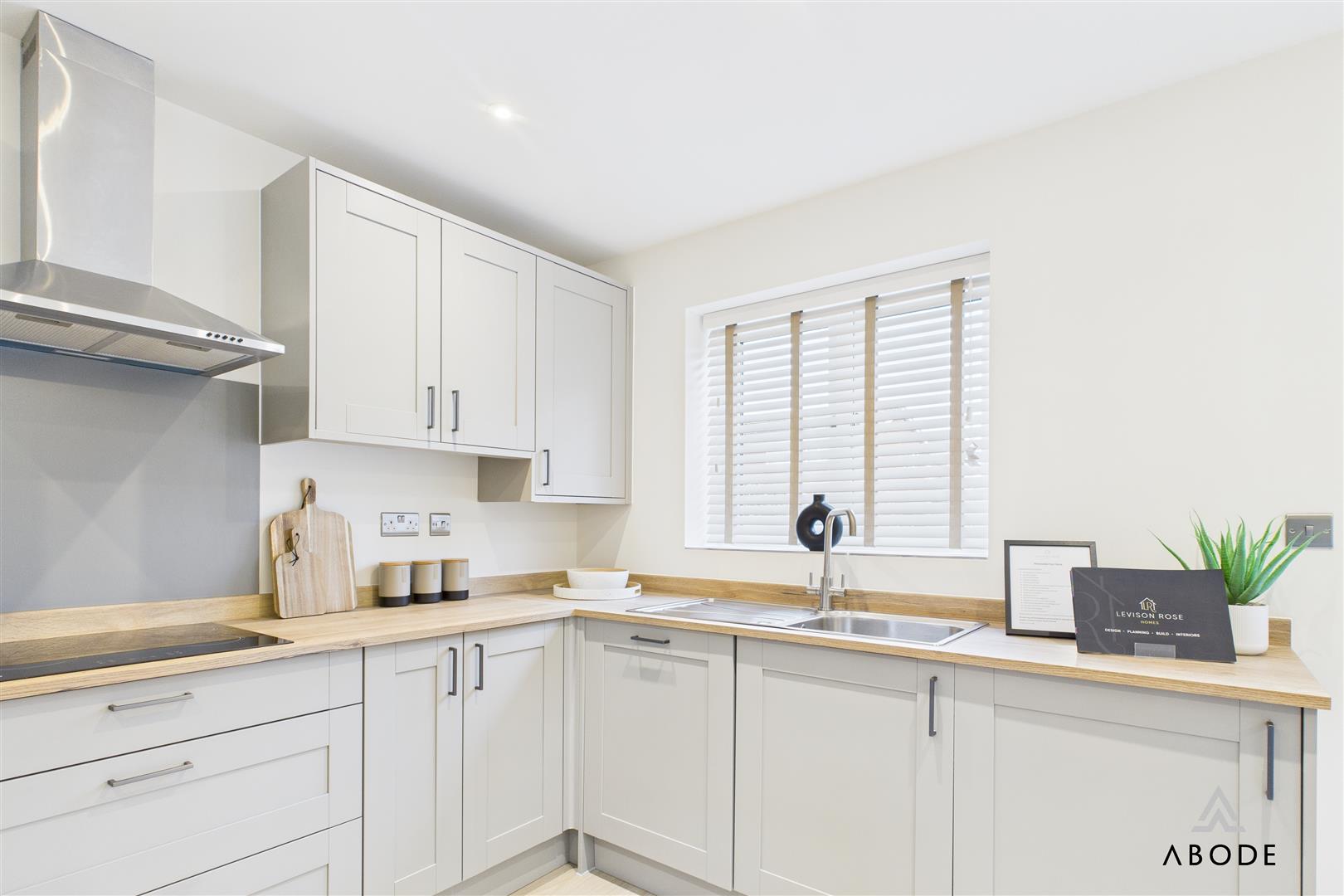 Every home is equipped with integrated kitchen appliances, including an oven, hob, and extractor as standard, with upgrade options available for additional integrated features. The kitchen is styled in a modern Shaker design with laminate worktops and matching splash backs behind the hob, and buyers have the opportunity to personalise their space with options such as quartz worktops, under-cabinet lighting, and extended wall tiling. French doors open from the dining area to the rear garden, creating a seamless connection between indoor and outdoor living.