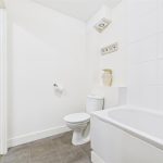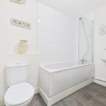The bathroom is fitted with a modern three-piece suite comprising a low-level WC with continental flush, pedestal wash basin with tiled splashback, and a panelled bath with shower over and side screen. Complementary tiling to the wall coverings is enhanced by a chrome heated towel radiator and extractor fan.