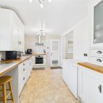 The kitchen is fitted with a range of matching wall and base units with complementary work surfaces, incorporating an integrated dishwasher, oven, hob with extractor, sink unit and space for additional appliances. Two windows overlook the rear garden and a side access door provides direct access outside, ideal for everyday use.