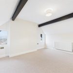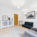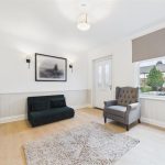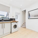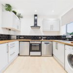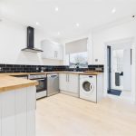 Well-equipped for modern living, the kitchen includes an integrated oven with a four-ring ceramic hob and a stylish black extractor hood, with dedicated space for both a dishwasher and washing machine. A large window overlooking the rear elevation fills the room with natural light, enhanced by recessed LED spotlights and light wood-effect flooring which adds to the sense of space.