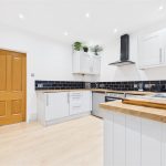 This beautifully presented kitchen serves as a stylish and functional heart to the home, boasting a clean, minimalist aesthetic and high-quality finishes throughout. The space is fitted with a comprehensive range of sleek white Shaker-style wall and base units providing ample storage, perfectly complemented by a striking black subway-tile backsplash and warm oak-effect work surfaces, creating a timeless monochrome contrast.