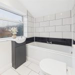 The family bathroom features a uPVC double glazed frosted window to the side elevation and is fitted with a four-piece suite comprising a low-level WC with continental flush, wash hand basin with mixer tap, panelled bath and separate shower cubicle. Complementary tiling surrounds the suite, and there is a vertically mounted heated towel radiator along with ceiling spotlights.