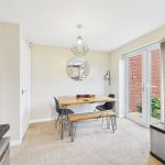 The kitchen diner spans the full width of the rear of the property, offering a well-planned kitchen area with matching wall and base units, preparation surfaces, an integrated oven with gas hob, space for further appliances, and a rear-facing window. The dining area provides space for a family dining table and benefits from double glazed French doors leading out onto the rear garden.