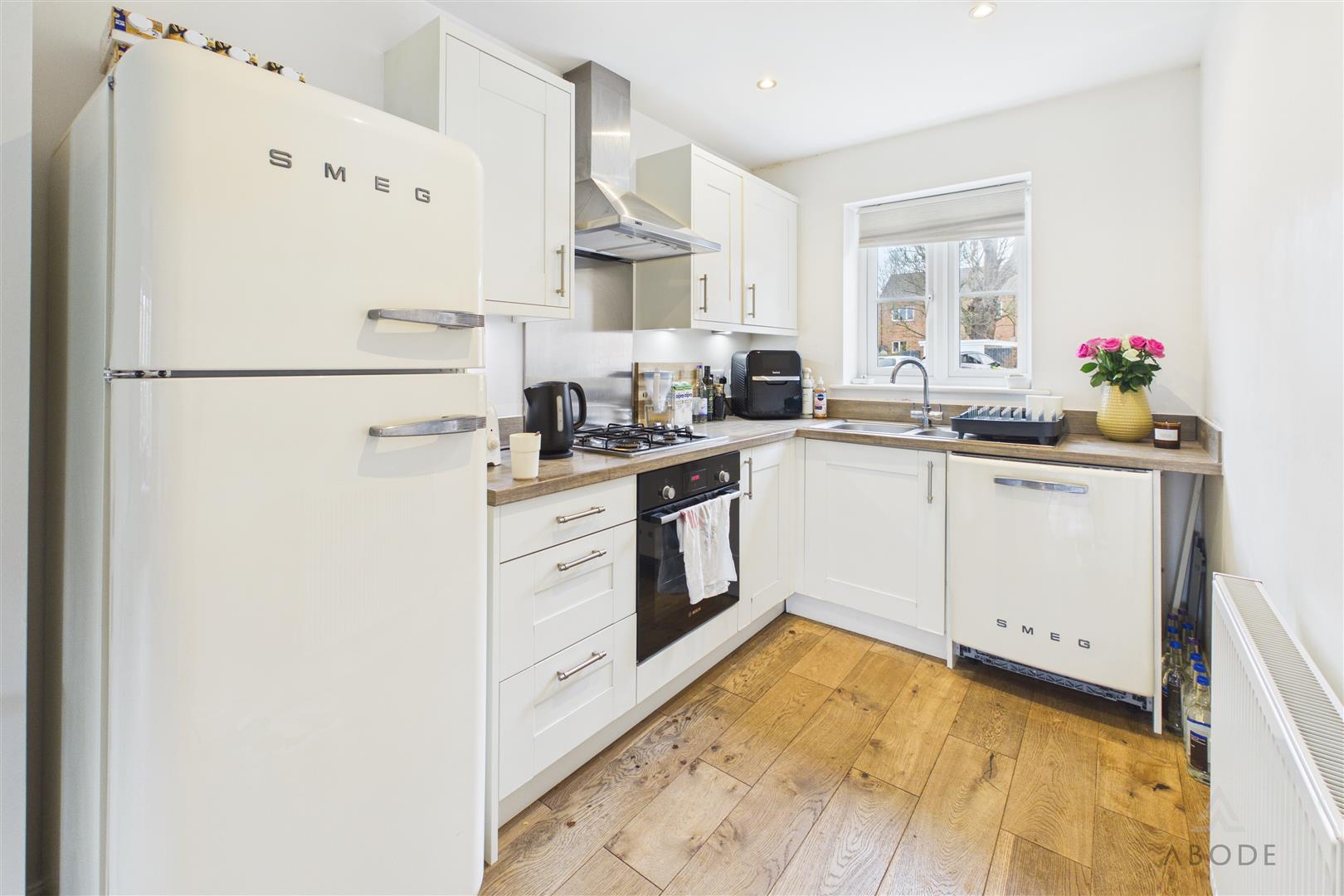 Fitted kitchen with work surfaces and a sink and drainer unit. Fitted oven and hob, appliance spaces, upvc double glazed window.