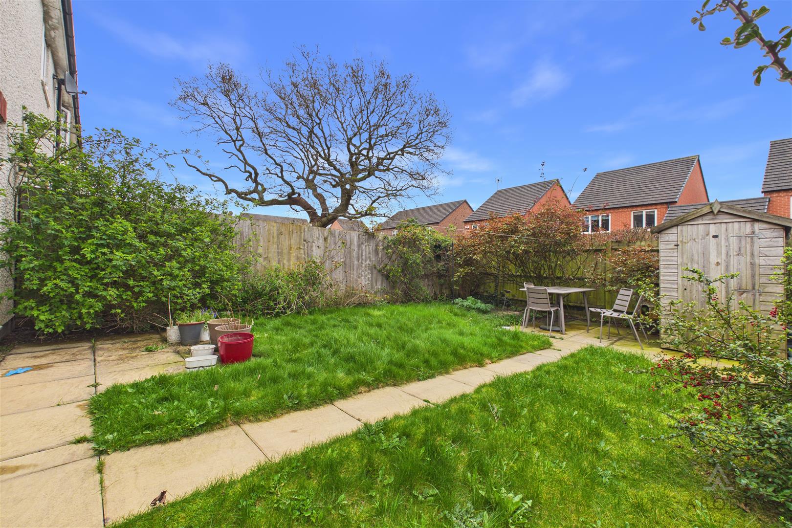 Enclosed rear garden with a lawn. Side long drive for 2 cars.